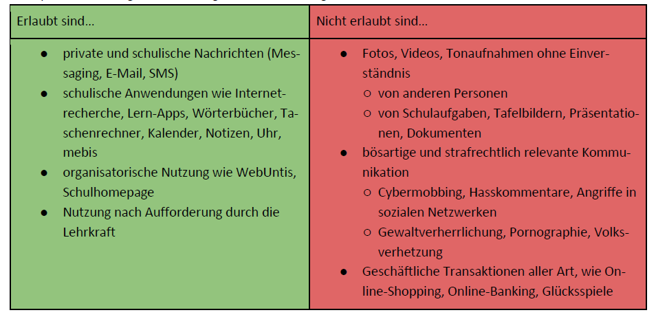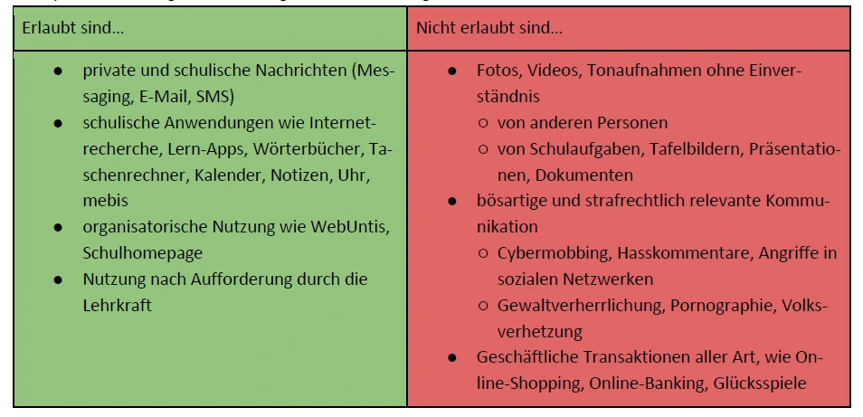 In einigen Regelungen sind erlaubte und unerlaubte Nutzungsarten direkt gegenübergestellt. Neben der Konkretisierung, für welchen Zweck Handys eingesetzt werden dürfen, kann auf diese Art auch übersichtlich beantwortet werden, wie, wo und wann das Handy an dieser Schule privat zu nutzen ist.
