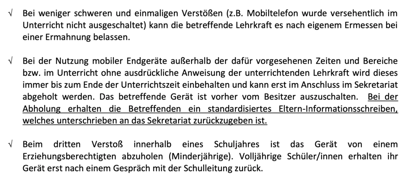 Das Einhalten der schuleigenen Regelungen muss unbedingt eingefordert werden. Verstöße sollten konsequent und einheitlich geahndet werden, ohne übermäßigen (bürokratischen) Mehraufwand für Schulpersonal nach sich zu ziehen. Hier ist es wichtig, dass alle Aufsicht führenden Personen an einem Strang ziehen. Standardisierte Elternschreiben und klar gestaffelte Vorgehensweisen bei (wiederholten) Verstößen können hilfreich sein.