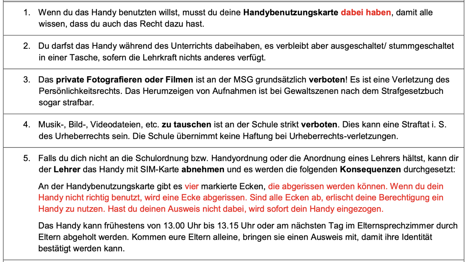 In Beispiel 5 wird ein Verfahren eingeführt, das die einzelnen Schülerinnen und Schüler in die Pflicht nimmt, ihr Recht zur privaten Handynutzung jederzeit nachweisen zu können (vgl. Punkt 1). Die Regeln für die „Handybenutzungskarte“ sind einfach und leicht verständlich gehalten (vgl. Punkt 5).