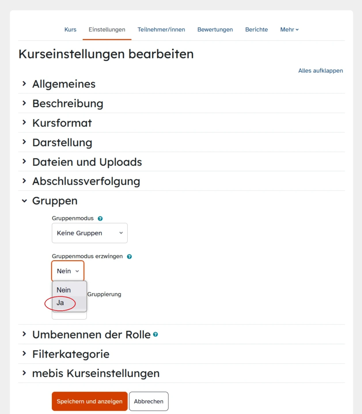 Wollen Sie nun durchweg innerhalb des Kurses Gruppen bilden, können Sie Ihren Kurs so einrichten, dass die Gruppeneinteilung für alle im Kurs hinterlegten Aktivitäten gilt. In diesem Fall werden die Teilnehmenden über die Kurseinstelllungen für den gesamten Kurs in Gruppen aufgeteilt und die Gruppenzuweisung gilt zwingend und ohne Ausnahme.