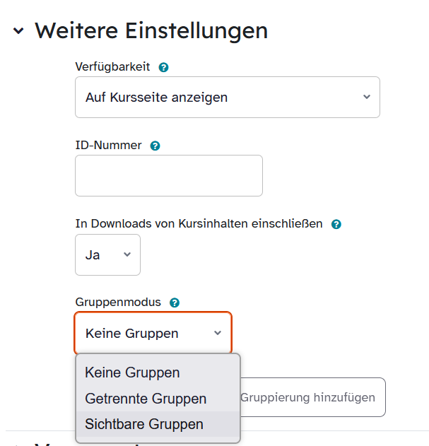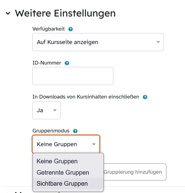 Über die Gruppeneinstellungen lässt sich ein aktiver Austausch der Lernenden einzig innerhalb ihrer jeweiligen Gruppe einrichten. Je nach gewähltem Gruppenmodus wird festgelegt, ob die Beiträge anderer Gruppen auch angesehen werden können („Sichtbare Gruppen”), oder ob nur die Beiträge der eigenen Gruppe lesbar sind („Getrennte Gruppen”).