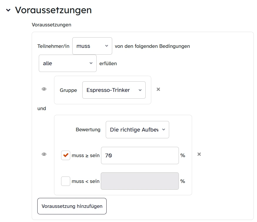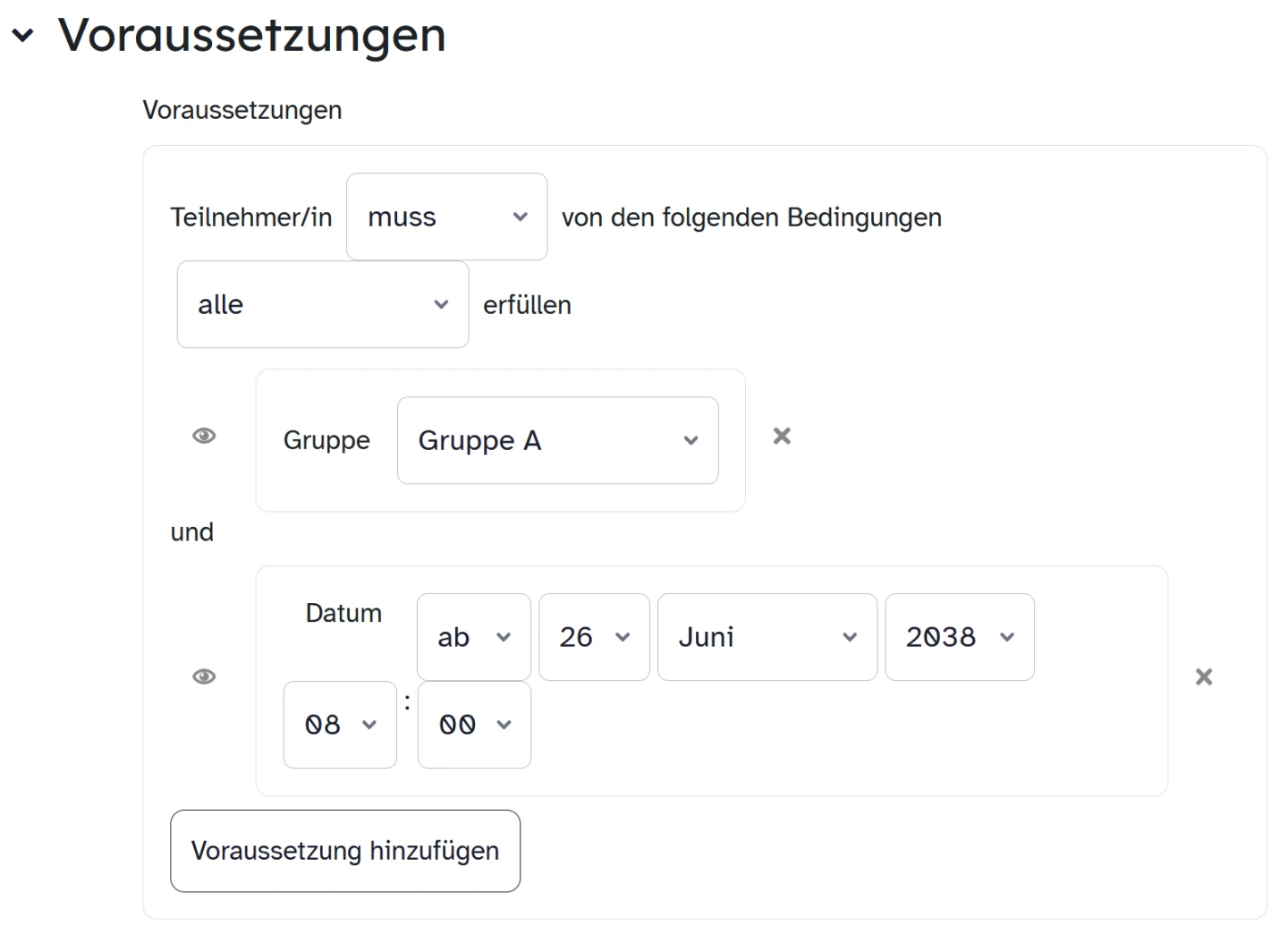 Hinweis: Um eine Aktivität automatisch zu einem bestimmten Termin verfügbar zumachen, kann als Bedingung für die „Bedingte Verfügbarkeit” zusätzlich zur Gruppenzugehörigkeit über „Voraussetzung hinzufügen” auch ein Verfügbarkeitsdatum angegeben werden.