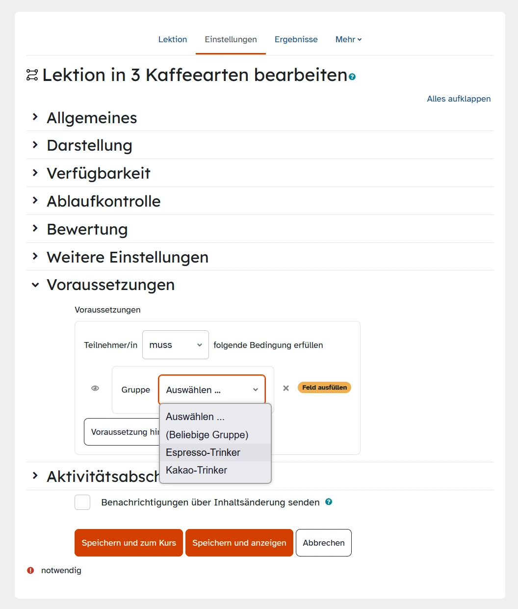 In Verbindung mit der Einstellungsoption „Bedingte Verfügbarkeit” können ganze Kursabschnitte oder einzelne Materialien bzw. Aktivitäten je nach Gruppenzugehörigkeit freigeschaltet werden. Das bietet sich etwa an, wenn Inhalte zunächst nur einem Teil der Klasse zur Verfügung gestellt werden sollen.