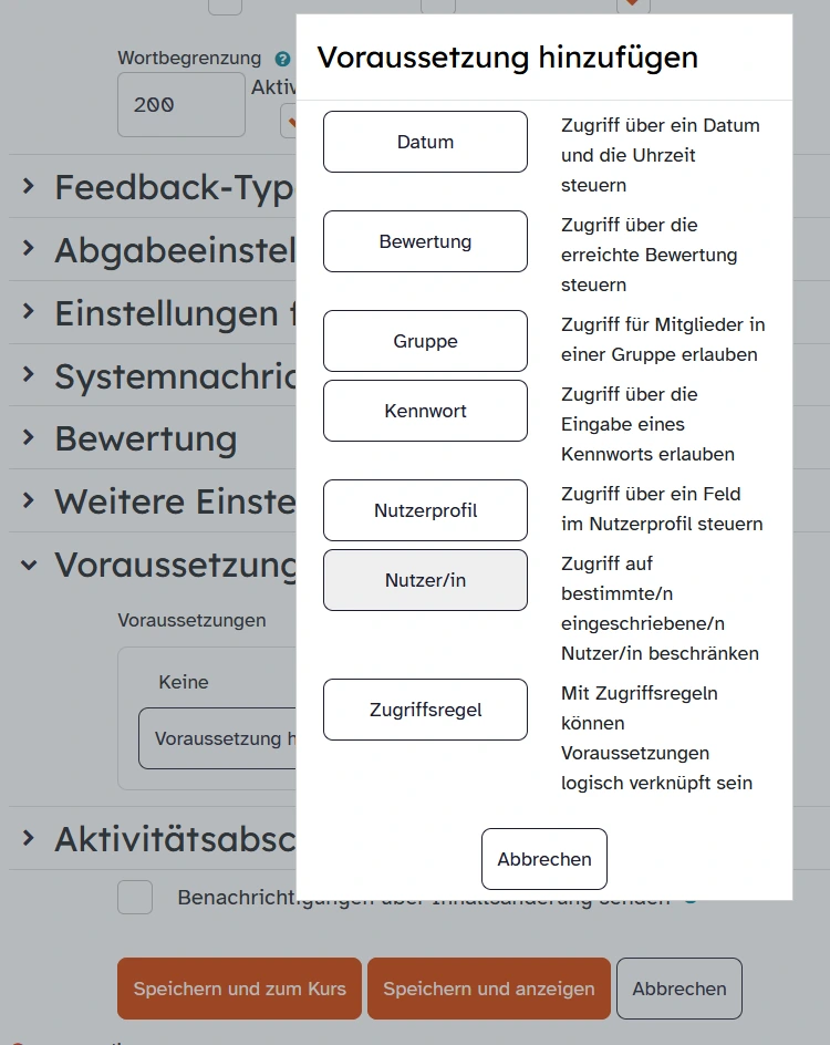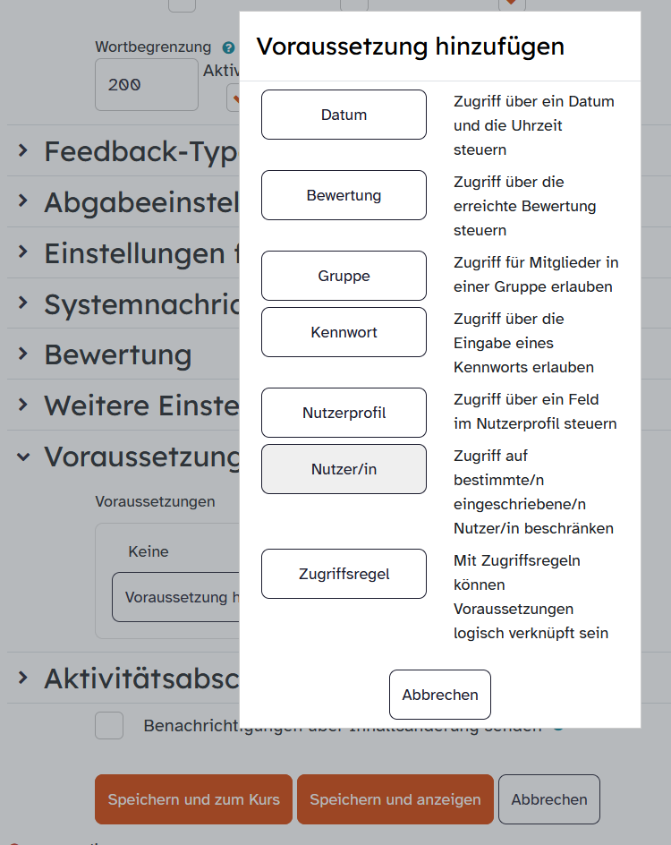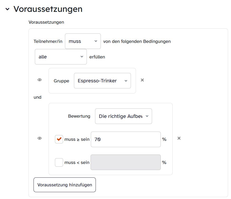 Wenn Sie unter den Einstellungen einer Aktivität den Reiter „Voraussetzungen” öffnen, können Sie den Zugriff auf bestimmte/n eingeschriebene/n Nutzer beschränken, auch ohne vorher Gruppen angelegt zu haben. Diese Vorgehensweise bietet sich an, wenn nur wenige Teilnehmende eine Aktivität bearbeiten sollen und der Gruppenmodus insgesamt nicht benötigt wird.