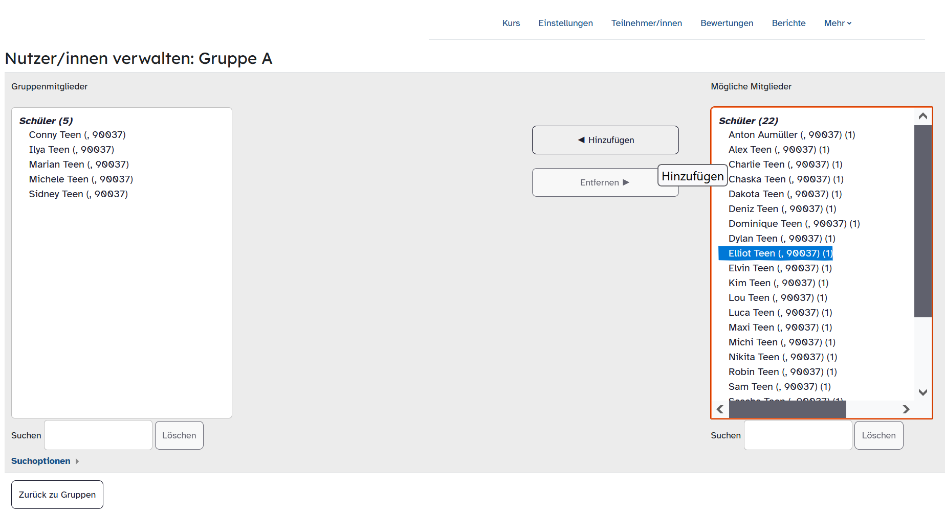 Die Lehrkraft verteilt die Schülerinnen und Schüler manuell auf die gewünschten, im Vorfeld bereits eingerichteten Gruppen.