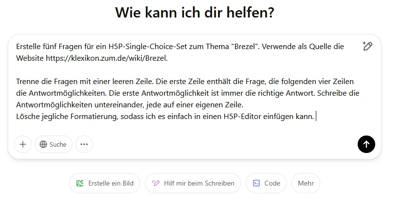 Wenn man eigene H5P-Inhalte nicht von Grund auf erstellen möchte, können KI-gestützte Tools eine große Hilfe sein. Mit deren Unterstützung lässt sich eine Vielzahl kreativer Inhalte generieren, die als Grundlage für H5P-Aktivitäten dienen können. Damit die KI-generierten Inhalte direkt in den H5P-Editor in der Lernplattform übernommen werden können, müssen sie jedoch spezifisch formatiert sein. Es ist daher wichtig, der KI klare Anweisungen zu geben, in welchem Format oder Code die Übungen produziert werden sollen. So kann man sicherstellen, dass die Inhalte ohne großen Aufwand kopiert und in den H5P-Editor eingefügt werden können.