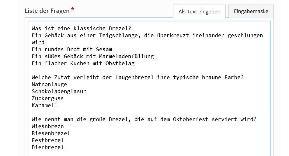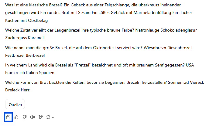 Nach dem Einfügen des Prompts können weitere Änderungen notwendig sein, wie das Einfügen oder Löschen von Zeilen oder das Entfernen von Sonderzeichen. Zudem kann es vorkommen, dass die Formatierung der Ausgabe nicht wie erwartet erscheint – etwa fehlende Sternchen oder Leerzeilen. Allerdings kann genau dieses Format für den H5P-Editor passend sein. Daher sollte der Prompt zunächst eingefügt und getestet werden, bevor Anpassungen vorgenommen werden (siehe Beispiel unter).