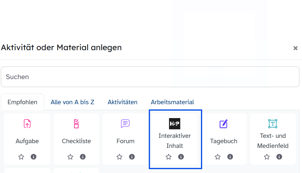 WeiterlesenDie Lernplattform stellt mit der Aktivität „H5P – Interaktiver Inhalt“ ein Werkzeug bereit, um interaktive Materialien zu gestalten. Der integrierte H5P-Editor bietet Hilfstexte und Hinweise, die Schritt für Schritt durch die Erstellung führen. Zur Auswahl stehen über 40 Inhaltstypen, darunter interaktive Videos, Drag and Drop-Aufgaben und Quizze.