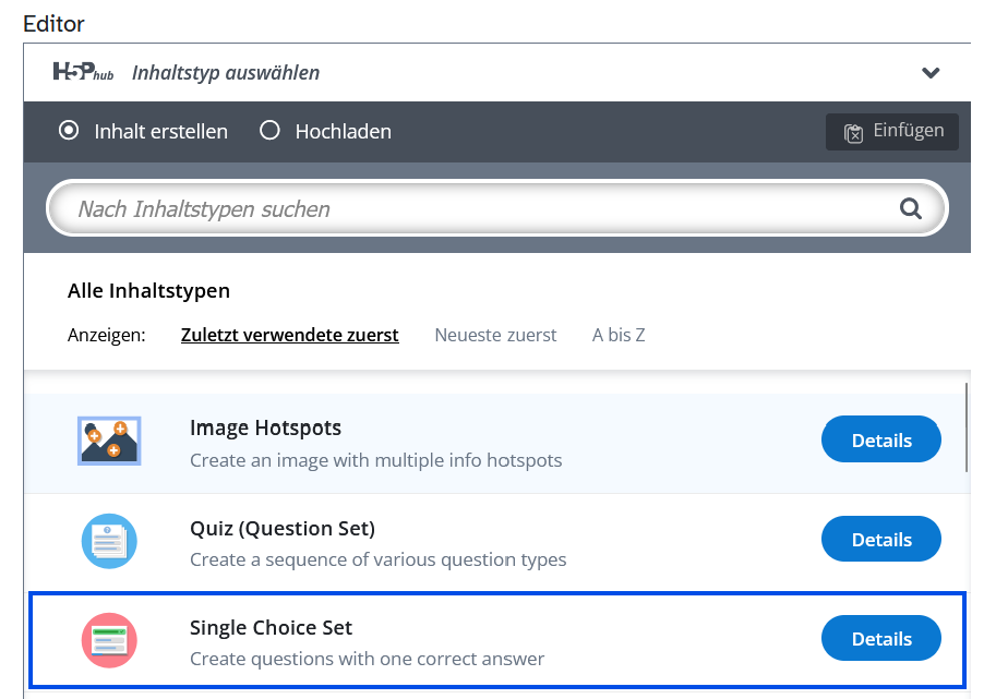Auf manchen Plattformen können Sie erstellte Inhalte direkt im H5P-Format speichern, um sie später erneut zu verwenden oder auf der Lernplattform hochzuladen. Folgen Sie den entsprechenden Links, um zu erfahren, wie genau H5P-Inhalte herunter- und hochgeladen werden können.