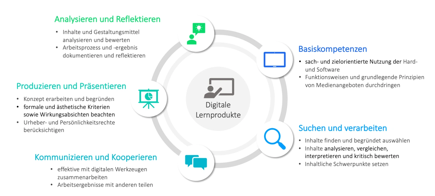 Durch die angeleitete Konzeption und Erstellung digitaler Lernprodukte im Unterricht erwerben Kinder und Jugendliche nicht nur Bedienkompetenzen, sondern festigen und erweitern ihr Wissen und Können auch in den Bereichen „Suchen und Verarbeiten“, „Kommunizieren und Kooperieren“, „Produzieren und Präsentieren“ sowie „Analysieren und Reflektieren“.