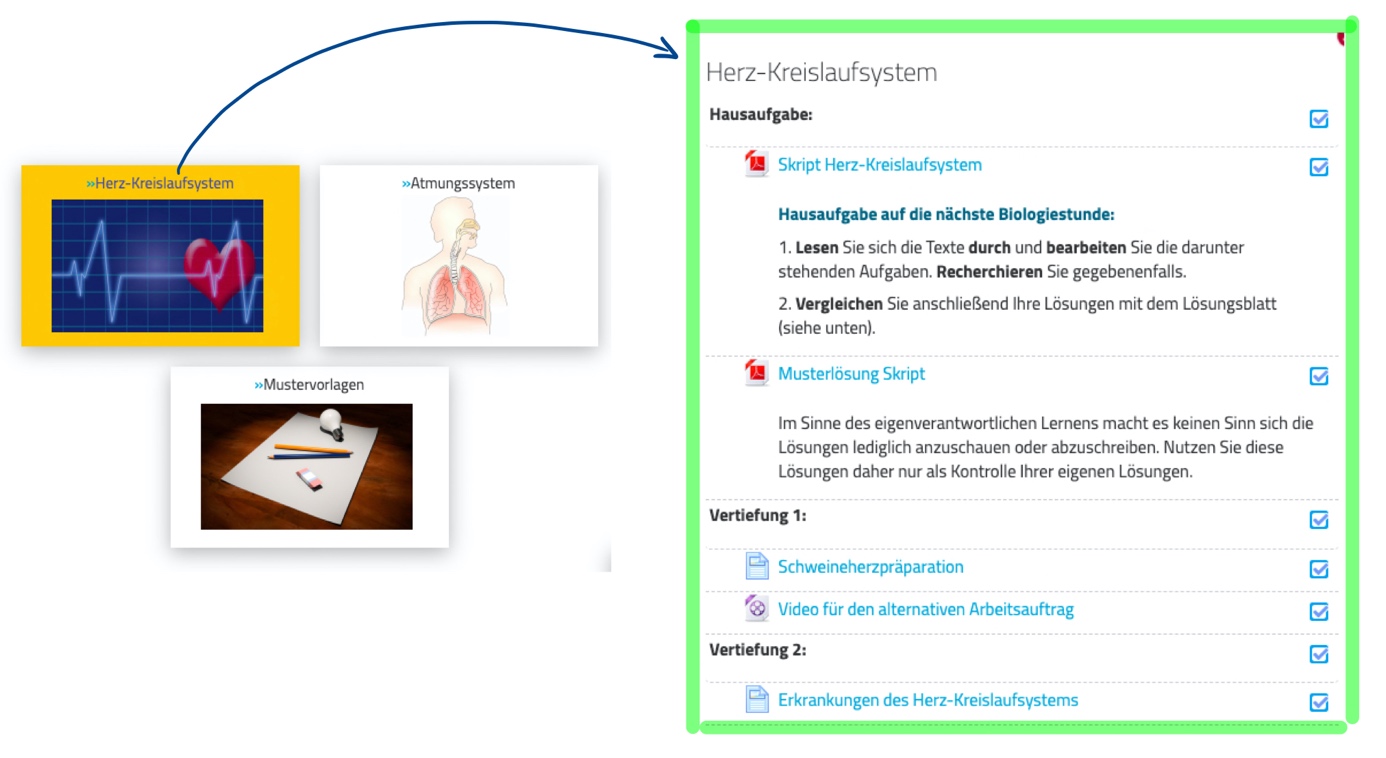 In den beiden Hauptabschnitten befindet sich das Material für die Erarbeitung. Dazu steht auch ein Erklärvideo bereit. Die SuS bereiten die jeweiligen Themen mit Hilfe des Schulbuchs und des Erklärvideos selbstständig vor. Die als Vertiefung gekennzeichneten Materialien eignen sich nun für die Verwendung in der Präsenzphase. Die SuS wenden ihr erworbenes Wissen beispielsweise bei der Präparation eines Schweineherzens oder der Erstellung eines Funktionsmodell der Lunge an.