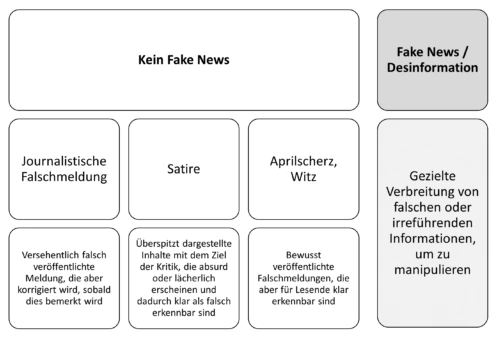 Eine journalistische Falschmeldung entsteht dann, wenn journalistische Medien versehentlich falsche Meldungen veröffentlichen (vgl. Sängerlaub, 2020, S. 101 f.; Wikipedia, 2021): Sie wurde früher umgangssprachlich auch „(Zeitungs-)Ente“ genannt. Die Meldung wird in dem Glauben, sie entspräche den Tatsachen, genauso verbreitet wie andere Informationen. Während bei „Fake News” falsche Meldungen in bewusster und manipulativer Absicht verbreitet werden, ist die journalistische Falschmeldung nicht intendiert bzw. entsteht oft durch unzureichende oder fehlerhafte Recherche und in Unkenntnis der Tatsachen sowie ohne Täuschungsabsicht.
