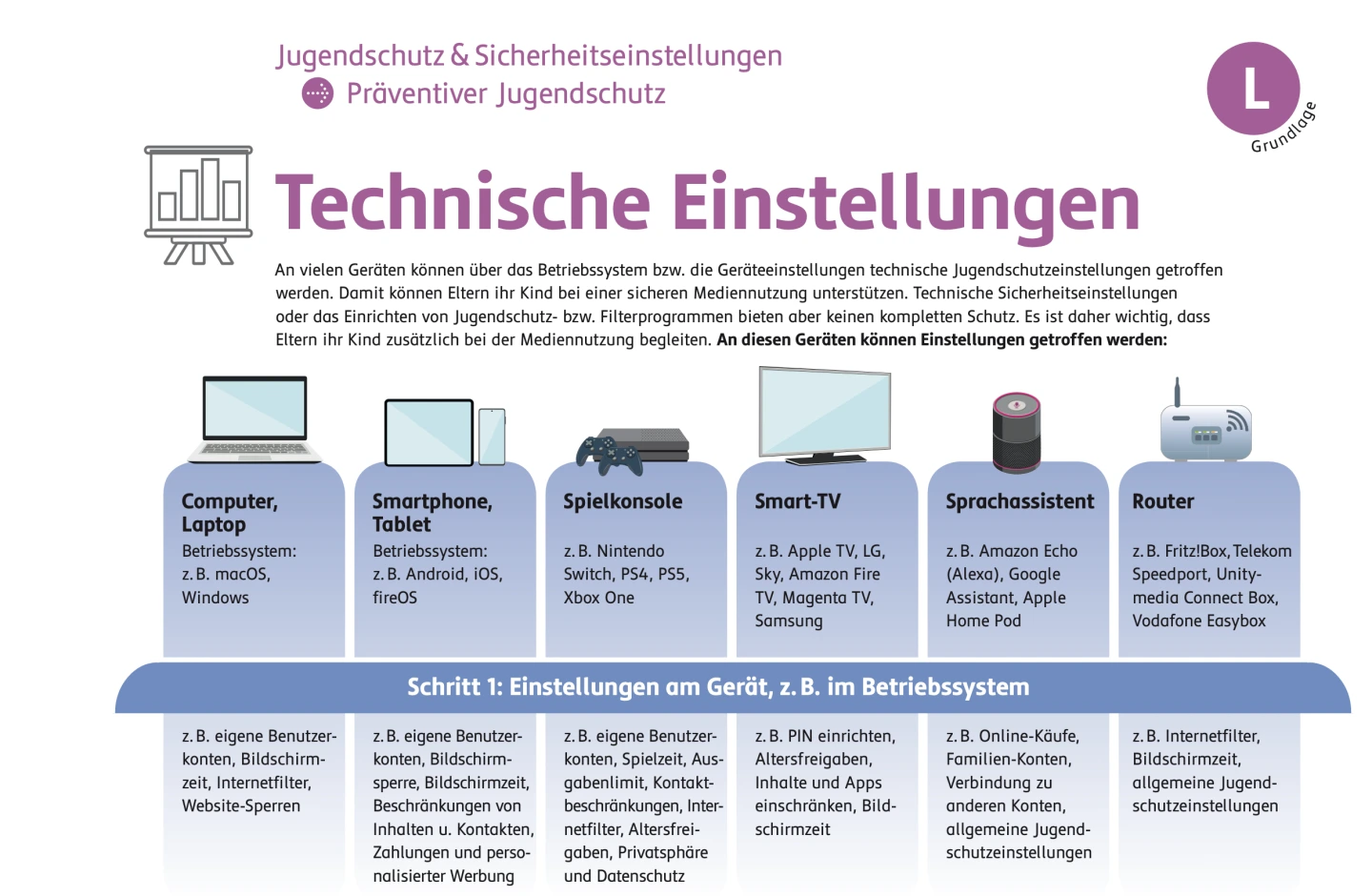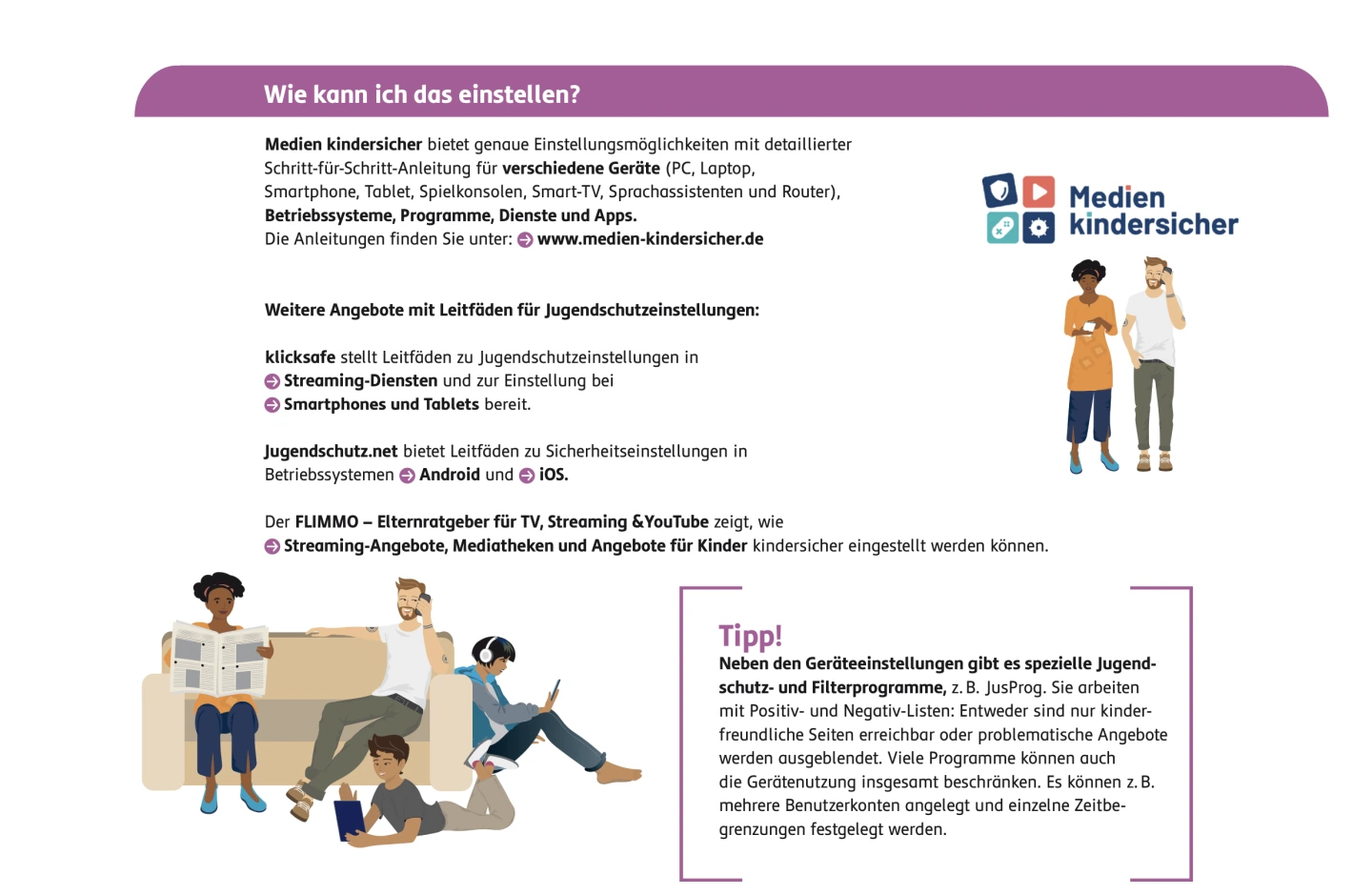 Hier finden Sie Downloads zum Thema Jugendmedienschutz, z.B. konkrete (technische) Sicherheitseinstellungen und die Rolle der Eltern sowie mögliche Elternfragen (FAQs).