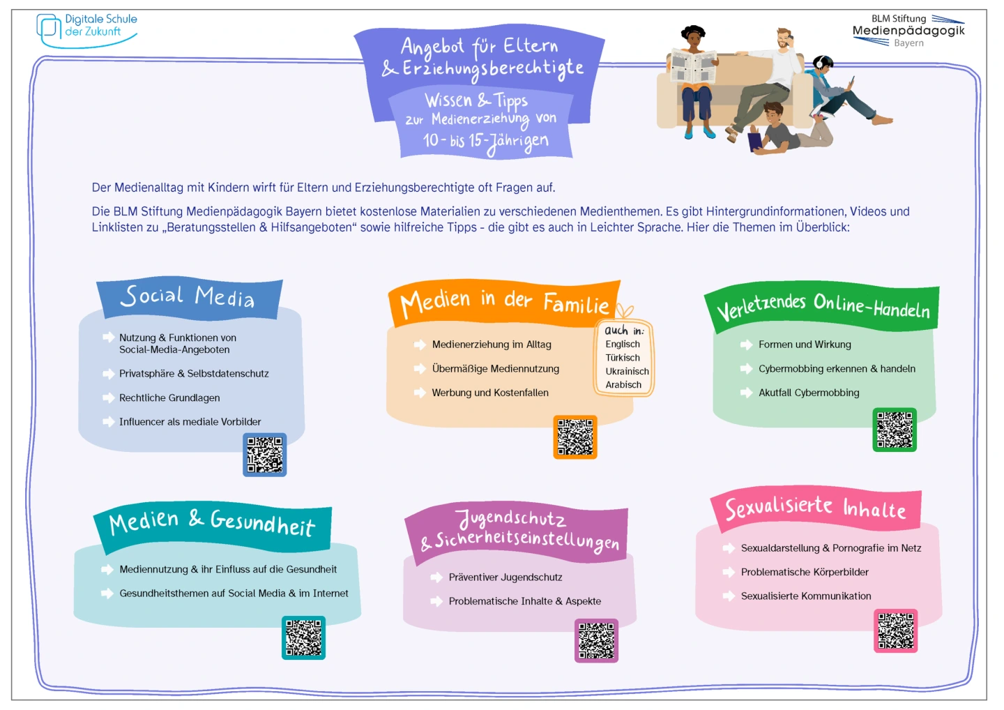Was ist Jugendmedienschutz und warum ist er wichtig? Welchen Gefahren können Kinder und Jugendliche online begegnen? Wie können Eltern ihr Kind vor problematischen Inhalten schützen? Wenn es um Medienerziehung geht, haben viele Eltern und Erziehungsberechtigte Fragen. Die BLM Stiftung Medienpädagogik Bayern bietet hierfür umfangreiche medienpädagogische Informationsmaterialien sowie FAQ- und Erklärvideos für Eltern.