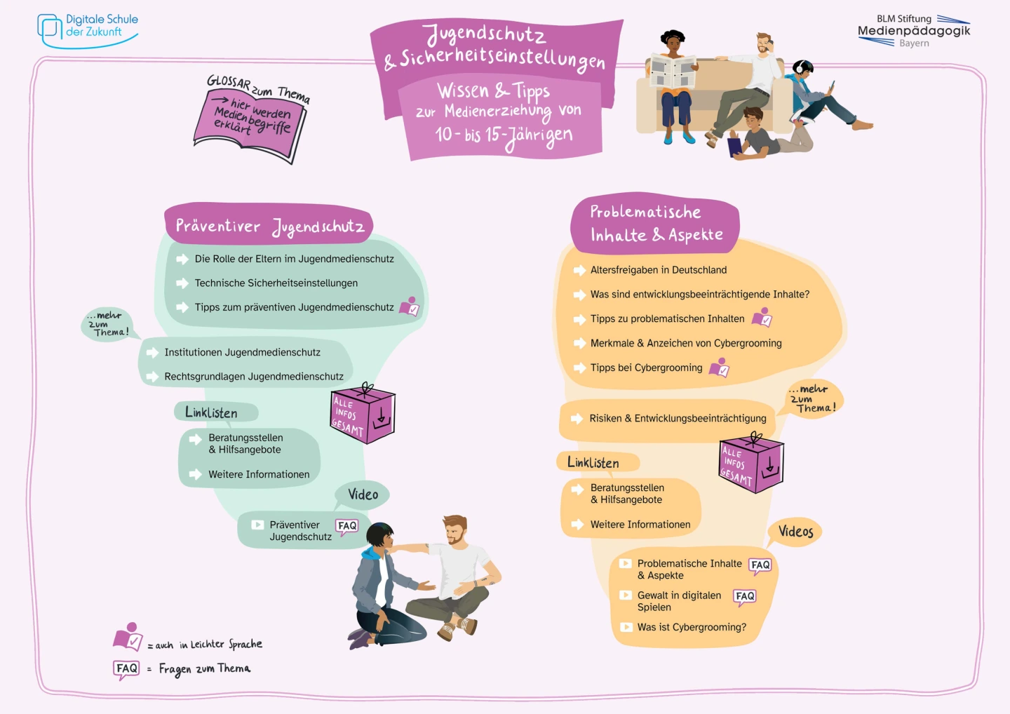 Jedes Thema enthält grundlegende und weiterführende Informationen sowie praktische Tipps für den Familienalltag, Links zu passenden Online-Angeboten, Beratungsstellen und Hilfsangeboten. Schlüsselbegriffe rund ums Thema „Jugendschutz und Sicherheitseinstellungen” finden Sie im Glossar.