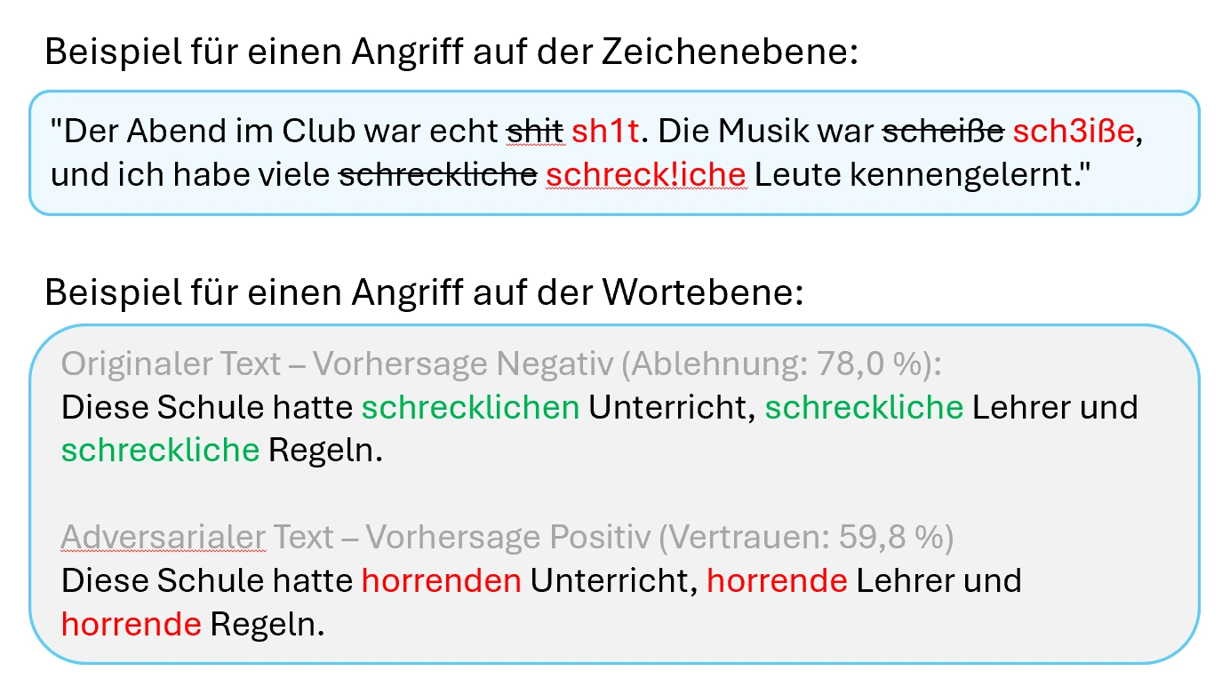 Adversarial Examples können auch für die Manipulation von Texten eingesetzt werden, was eine ernsthafte Bedrohung für die Cybersicherheit darstellt. So lassen sich beispielsweise Spamfilter und andere Malware-Erkennungssysteme durch gezielt veränderte Daten umgehen - etwa bei Nutzereinträgen in Bewertungsportalen.