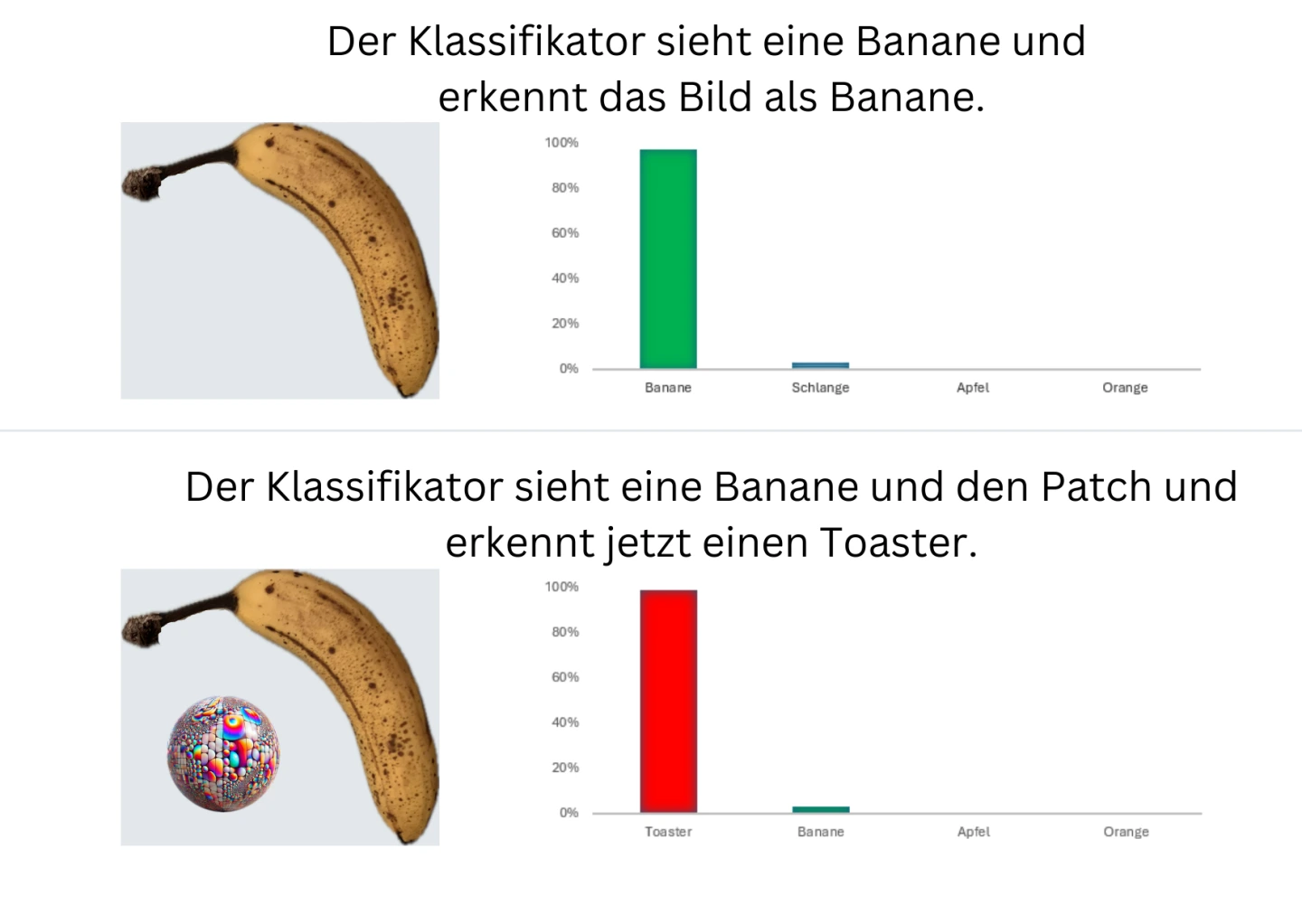 Ein Adversarial Attack kann auch mit einem physischen Aufkleber, einem sogenannten Patch, durchgeführt werden. Liegt wie im hier gezeigten Beispiel der ausgedruckte Patch neben einer Banane, erkennt der Bildklassifikator statt der Banane einen Toaster (Brown, 2018).