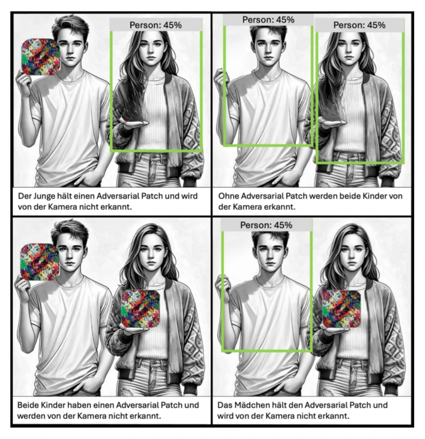 Stellen Sie sich vor, Sie könnten ein T-Shirt mit einem speziellen Muster tragen und damit für die Kameras eines Überwachungssystems unsichtbar werden. In unserem Titelbild hält der Junge ein sogenanntes Adversarial Patch in der Hand. Dieses Muster wurde gezielt so berechnet, dass es die Objekterkennungssoftware täuscht. Die Folge: Die Person, die das Schild mit dem Muster hält, wird von der Kamera nicht erkannt – als wäre sie unsichtbar. Man könnte sagen, es ist wie ein Tarnumhang aus der Welt von Harry Potter – nur nutzt man hier statt Magie bewusst Schwachstellen der künstlichen Intelligenz.