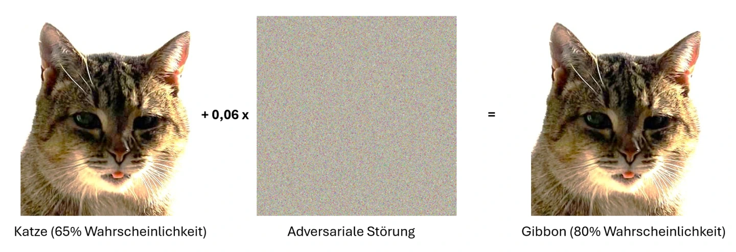 Ein anschauliches Beispiel für diese Art von Täuschung ist die Manipulation eines Bildes, das von einem neuronalen Netzwerk ursprünglich als Katze korrekt erkannt wurde. Durch die gezielte Veränderung nur weniger Pixel, die für das menschliche Auge unsichtbar ist, wird das Bild plötzlich mit einer Wahrscheinlichkeit von 80% als Gibbon identifiziert. Diese kleine, scheinbar unbedeutende Veränderung führt zu einer erheblichen Fehleinschätzung und damit auch zu einem massiven Vertrauensverlust in KI-Systeme (Goodfellow, 2015).