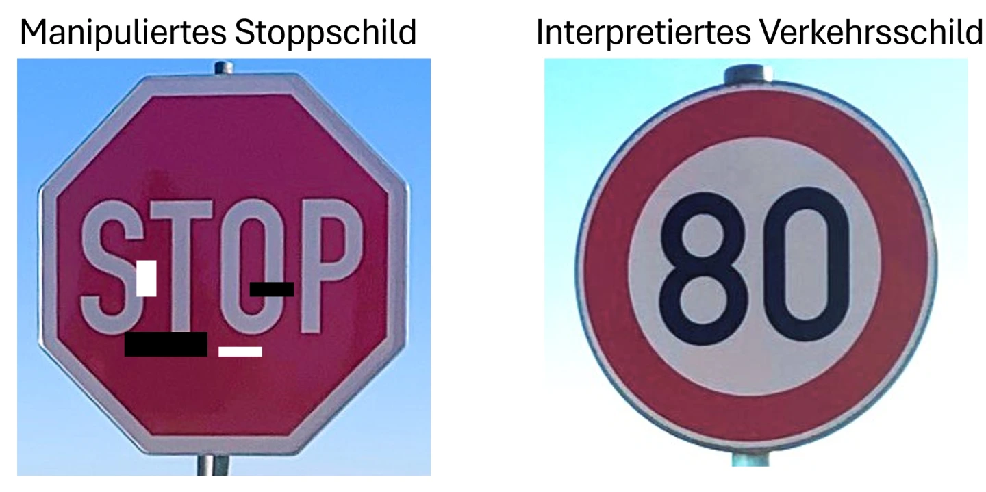 Ein kritisches Szenario wäre etwa, wenn ein Stoppschild durch einen unauffälligen Aufkleber so manipuliert wird, dass das Fahrzeug es fälschlicherweise als Geschwindigkeitsbegrenzung auf 80 km/h interpretiert. Ebenso könnten manipulierte Markierungen auf der Fahrbahn dazu führen, dass ein Fahrzeug in die falsche Spur geleitet wird - mit möglicherweise schwerwiegenden Folgen für den Verkehr (Eykholt, 2018).