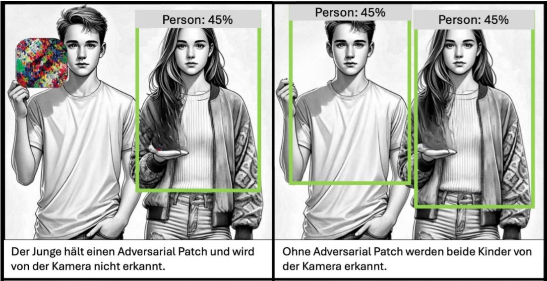 Ein anschauliches Beispiel für solche physikalischen Manipulationen ist das in der Einleitung erwähnte getäuschte Überwachungssystem. Hier wird ein Adversarial Patch genutzt – ein speziell gestaltetes Muster, das die Objekterkennung eines KI-gestützten Bildverarbeitungssystems gezielt stört. Während die abgebildeten Personen für einen menschlichen Betrachter klar erkennbar sind, identifiziert das System die linke Person nur mit einer Wahrscheinlichkeit von 45 %. Solche Adversarial Patches können dazu genutzt werden, die Klassifikationsmechanismen von Überwachungssystemen, Gesichtserkennungssoftware oder autonomen Fahrzeugsensoren gezielt auszutricksen.