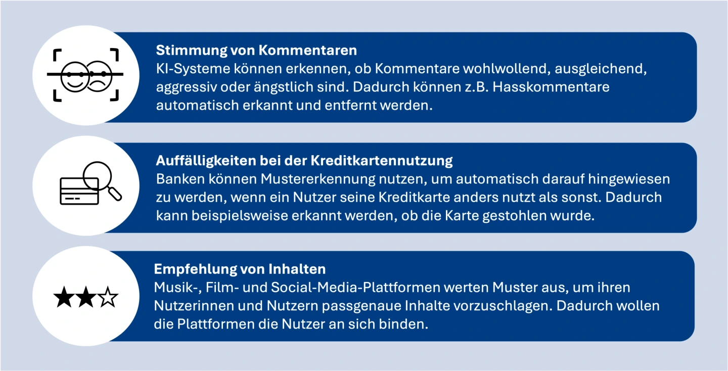KI-Systeme können beispielsweise sehr gut Muster in Daten erkennen. Hier sind Beispiele, wo das genutzt werden kann: