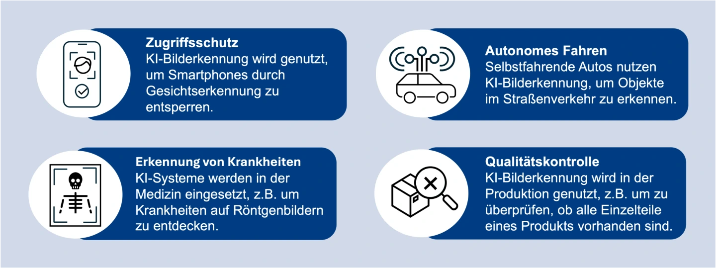 KI-Systeme können Bilder sehr genau analysieren und darauf Objekte, Gesichter oder sogar Gefühle erkennen. Hier sind Beispiele, wie die KI-gestützte Bilderkennung eingesetzt werden kann: