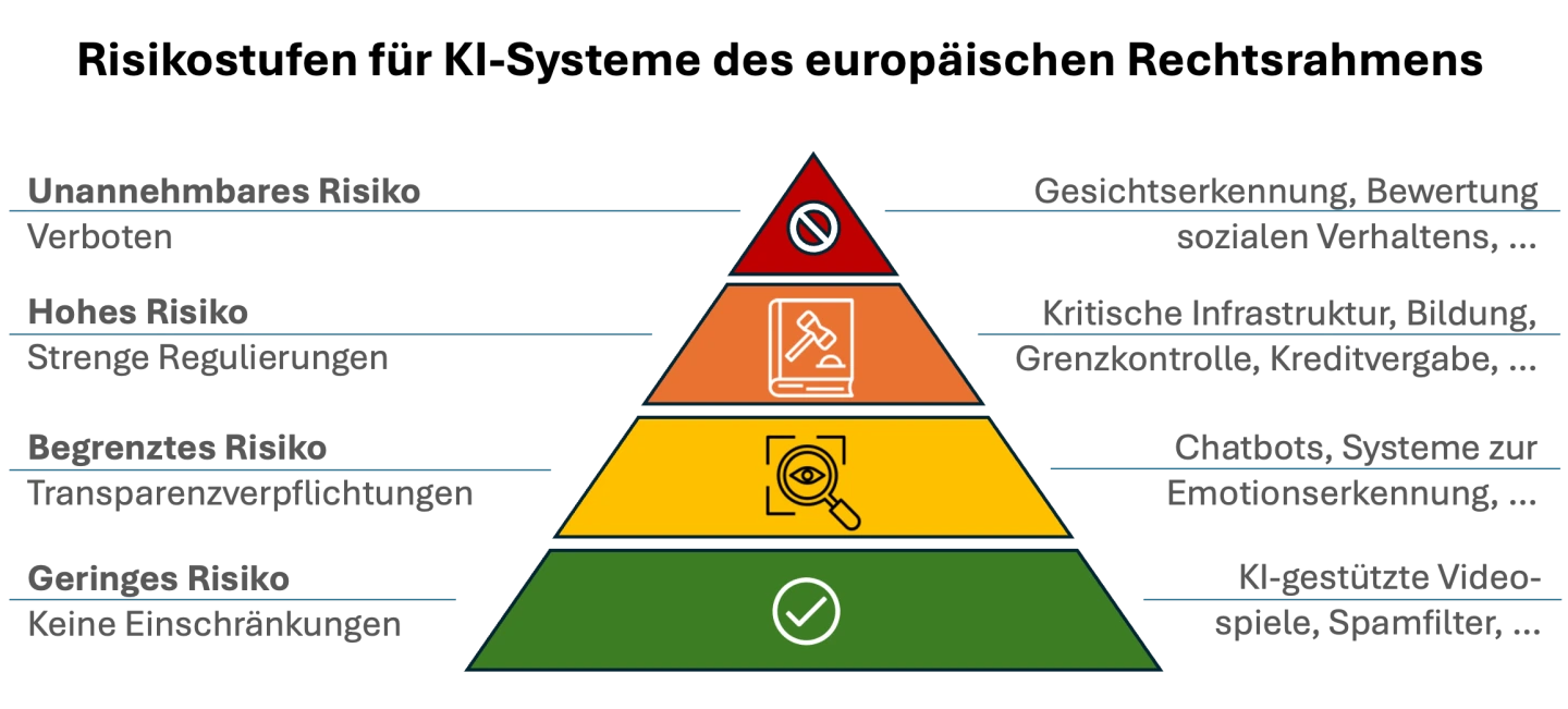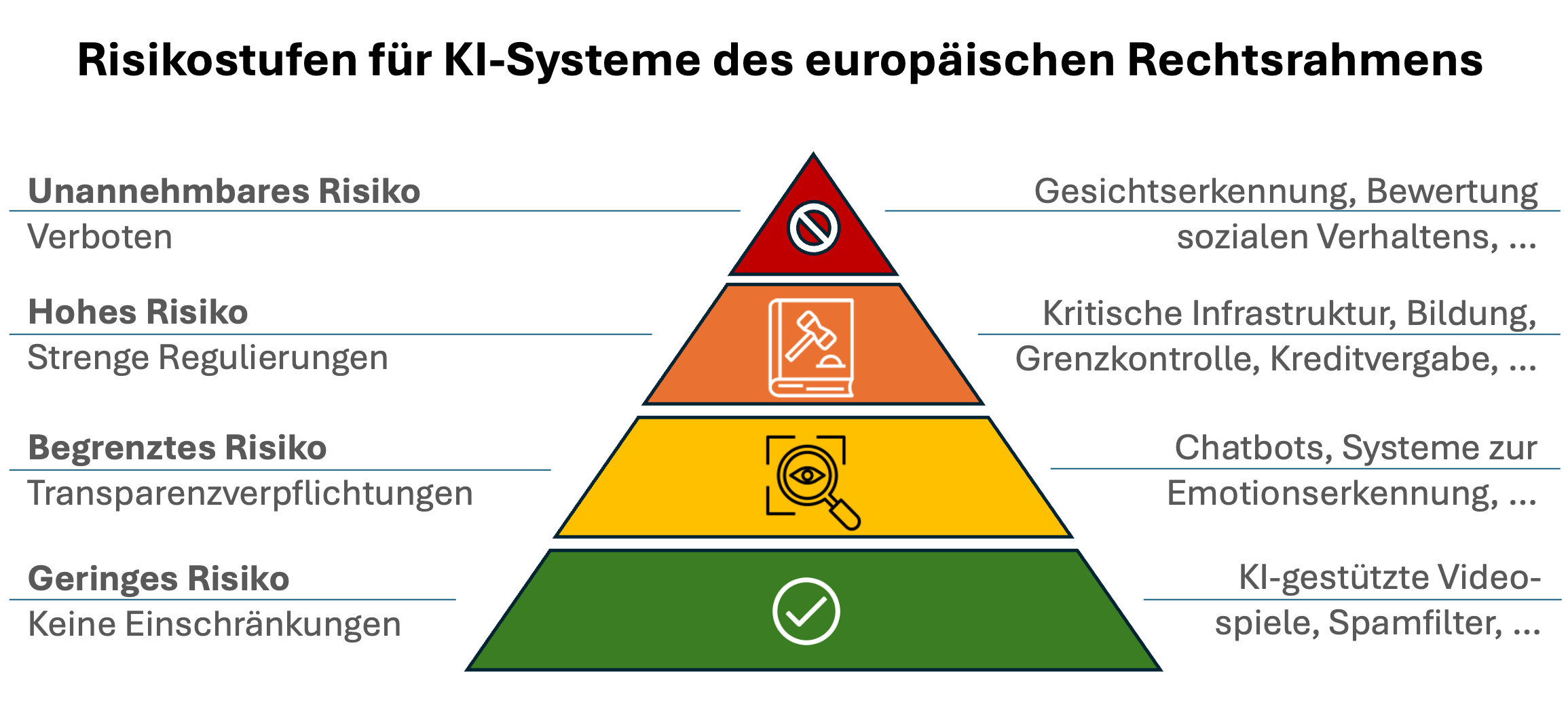 Das Regelwerk hat eine umfassende Regulierung aller KI-Systeme zum Ziel, steht jedoch vor der Herausforderung, dass es keine einheitliche Definition von KI gibt. Daher basiert der AI Act auf einer breiten Definition von KI, die auch zukünftige Entwicklungen im KI-Bereich im Blick hat, und verfolgt einen risikobasierten Ansatz, bei dem das rechtliche Eingreifen auf das Risiko-Niveau des jeweiligen KI-Systems zugeschnitten ist. Dazu unterscheidet das Werk zwischen den in der folgenden Grafik dargestellten vier Risiko-Stufen.