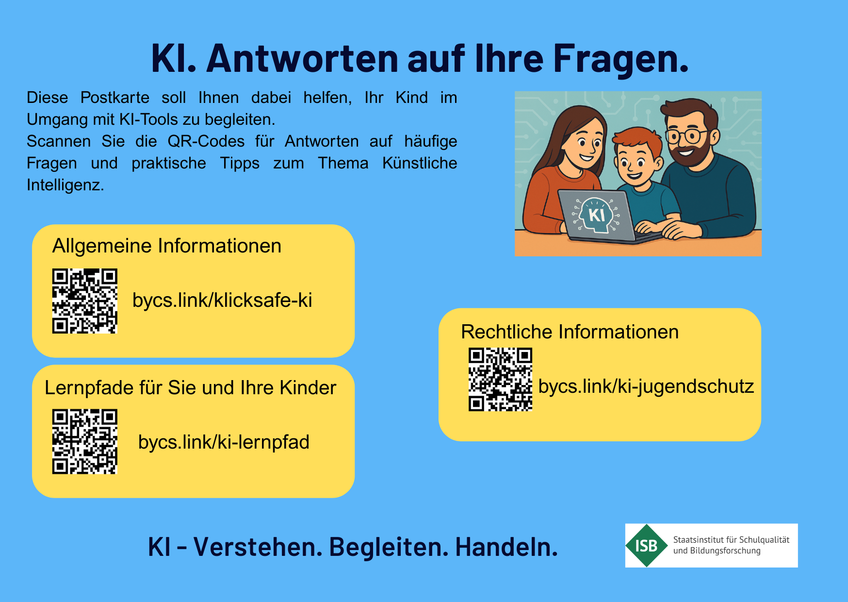 Dieser Flyer im Postkartenformat enthält QR-Codes und Kurzlinks und leitet Sie zu einschlägigen Informationsangeboten zum Thema „Künstliche Intelligenz in Schule und Familie”.