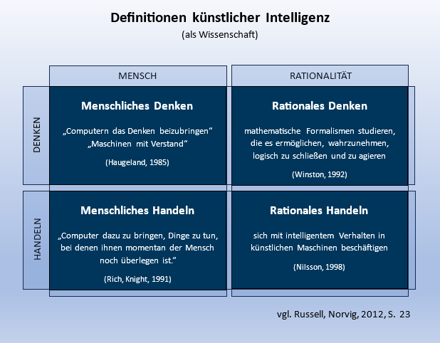 Durch diese vier Bezugsgrößen „menschliche Leistung“ und „Rationalität“ sowie „Denkprozesse/logisches Schließen“ und „Handeln/Verhalten“ ergibt sich das oben illustrierte Raster aus vier Kategorien, welche es ermöglichen, die Vielfalt der unterschiedlichen Definitionen von KI aufzuzeigen und deren Gemeinsamkeiten und Unterschiede besser greifbar zu machen. (Russell, Norvig, 2012).