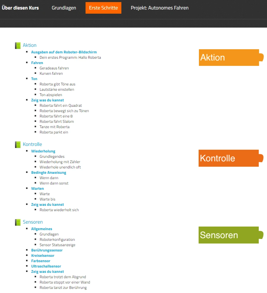 Im freien teachSHARE Kurs Open Roberta 2.0 werden Lernende mit dem Open Roberta Lab vertraut gemacht. Der Kurs stellt ein Angebot von praxisbezogenen und motivierenden Aufgabenstellungen bereit, die Lernende mithilfe des openRoberta Lab umsetzen können. Schülerinnen und Schüler können Grundbegriffe aus dem Bereich Algorithmen spielerisch erlernen und erhalten einen Einstieg in die Arbeit mit Robotern.