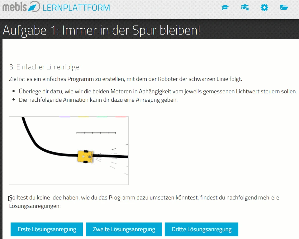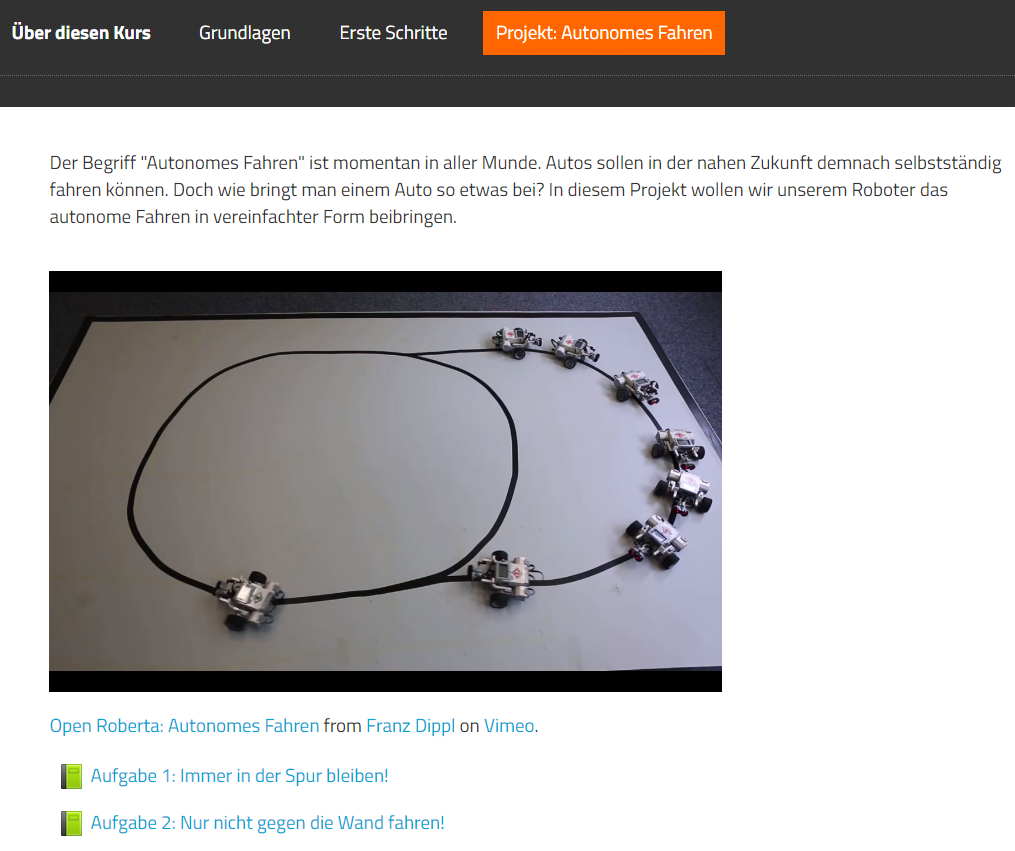 Im Abschnitt „Autonomes Fahren” werden die Schülerinnen und Schüler mithilfe zweier mehrstufiger Aufgabenstellungen angeleitet selbstständig Programme umzusetzen: