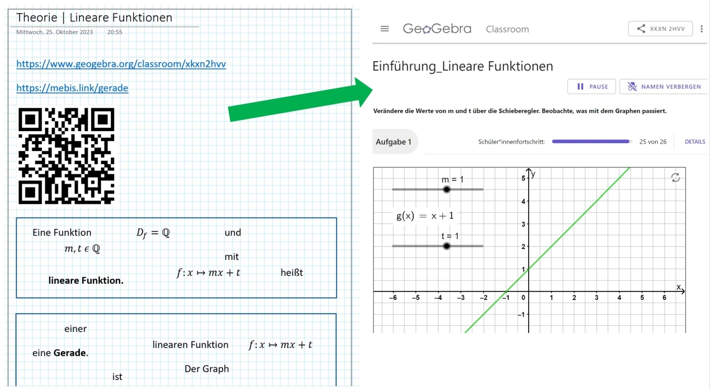 Eine interaktive Lernumgebung kann für Mathematik beispielsweise in GeoGebra Classroom erstellt werden. Das Material ist über einen Link und einen QR-Code leicht mit Kolleginnen bzw. Kollegen zu teilen. Zudem ist es anpassbar und leicht in verschiedenen 1:1-Klassen im Unterricht einzusetzen.
