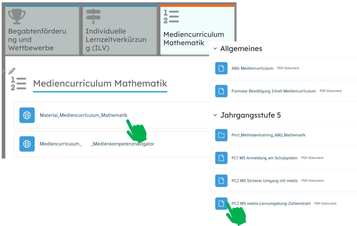 Im mebis Fachschaftsraum sind alle Unterrichtsmaterialien, die zur Durchführung der Inhalte des Mediencurriculums benötigt werden zu finden. Beispielsweise ist die Mathematiklehrkraft in der Jahrgangsstufe 5 für die Erstanmeldung in der mebis Lernplattform verantwortlich. Hierfür ist auch eine Lernumgebung zum Zahlenstrahl hinterlegt, wo diejenigen Kinder, die die Anmeldung geschafft haben, gleich interaktive Übungen bearbeiten können.