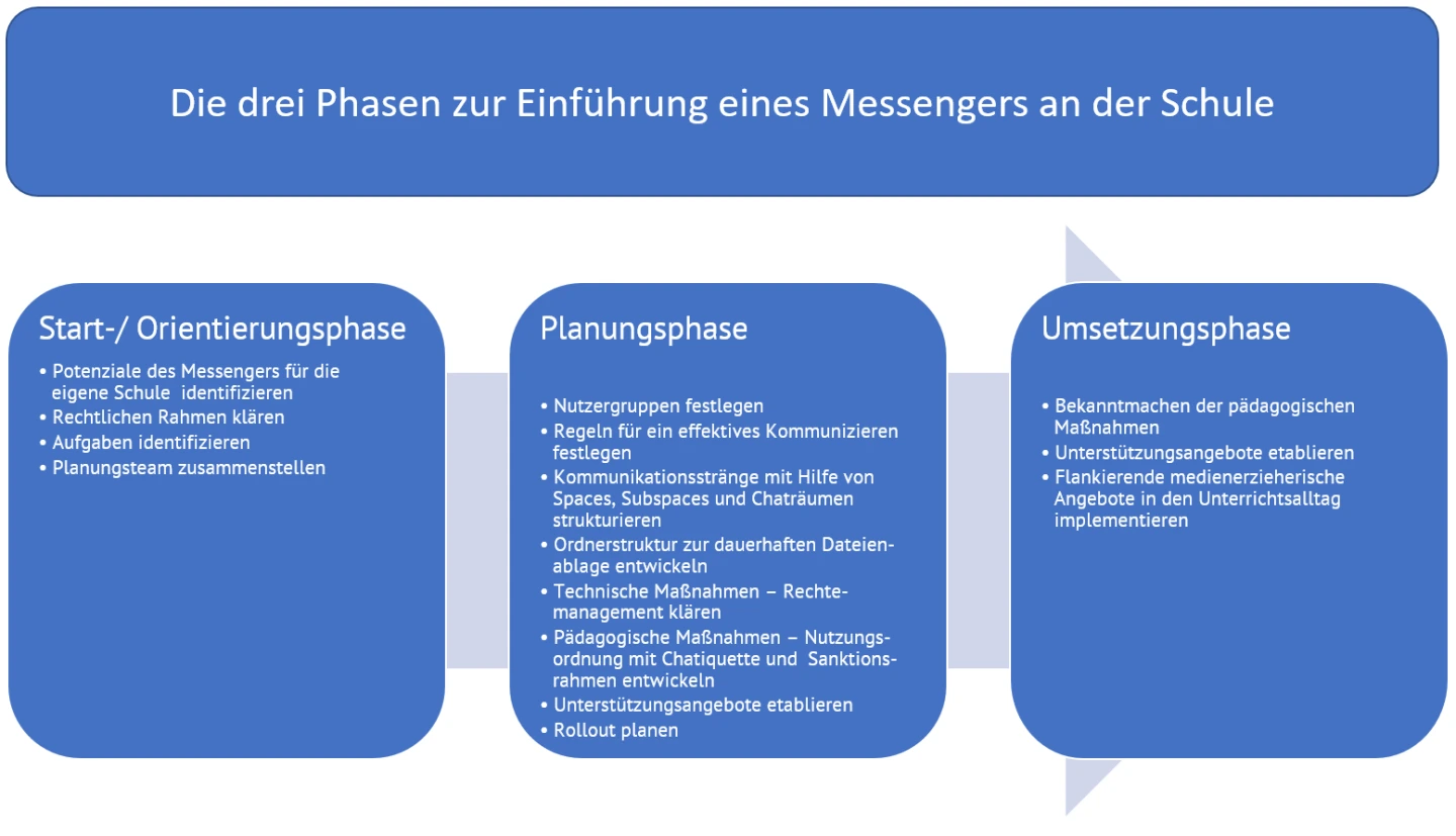 Ziel der sich anschließenden Planungsphase ist es, die Rahmenbedingungen für die Nutzung des Messengers an der Schule zu klären. Hierzu werden die in der Orientierungsphase identifizierten Aufgaben auf die Erfordernisse und Besonderheiten der eigenen Schule abgestimmt, konkretisiert und soweit möglich umgesetzt. Die Planungsphase zur Einführung des Messengers beinhaltet folgende Aufgaben: