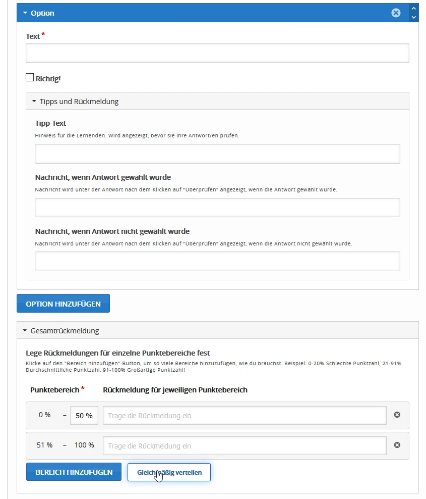 Auch beim summativen Feedback, das nicht zur Leistungsmessung sondern zur Lernförderung dient, sollte eine qualitative Einschätzung der Antworten der Lernenden stattfinden. Dies kann automatisiert erreicht werden, wenn in einer Aufgabe Rückmeldungen zu einzelnen Teilaufgaben zwar angelegt werden, diese für die Lernenden aber erst nach Abgabe eines Abschlusstest verfügbar gemacht werden.