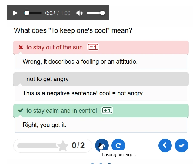 Idealerweise wird beim Anlegen der Aufgaben von der Lehrkraft dieses formative Feedback durch qualitative Aussagen ergänzt. Je nach Antwort erhalten die Lernenden somit konkrete Hinweise für die richtige Lösung und Begründungen und Erläuterungen bei typischen Fehlern, beispielsweise „He, she, it – das 's' muss mit!”. Aus Sicht der Lernenden ist der höhere Aufwand bei der Erstellung entsprechender Aufgaben dabei mehr als gerechtfertigt.