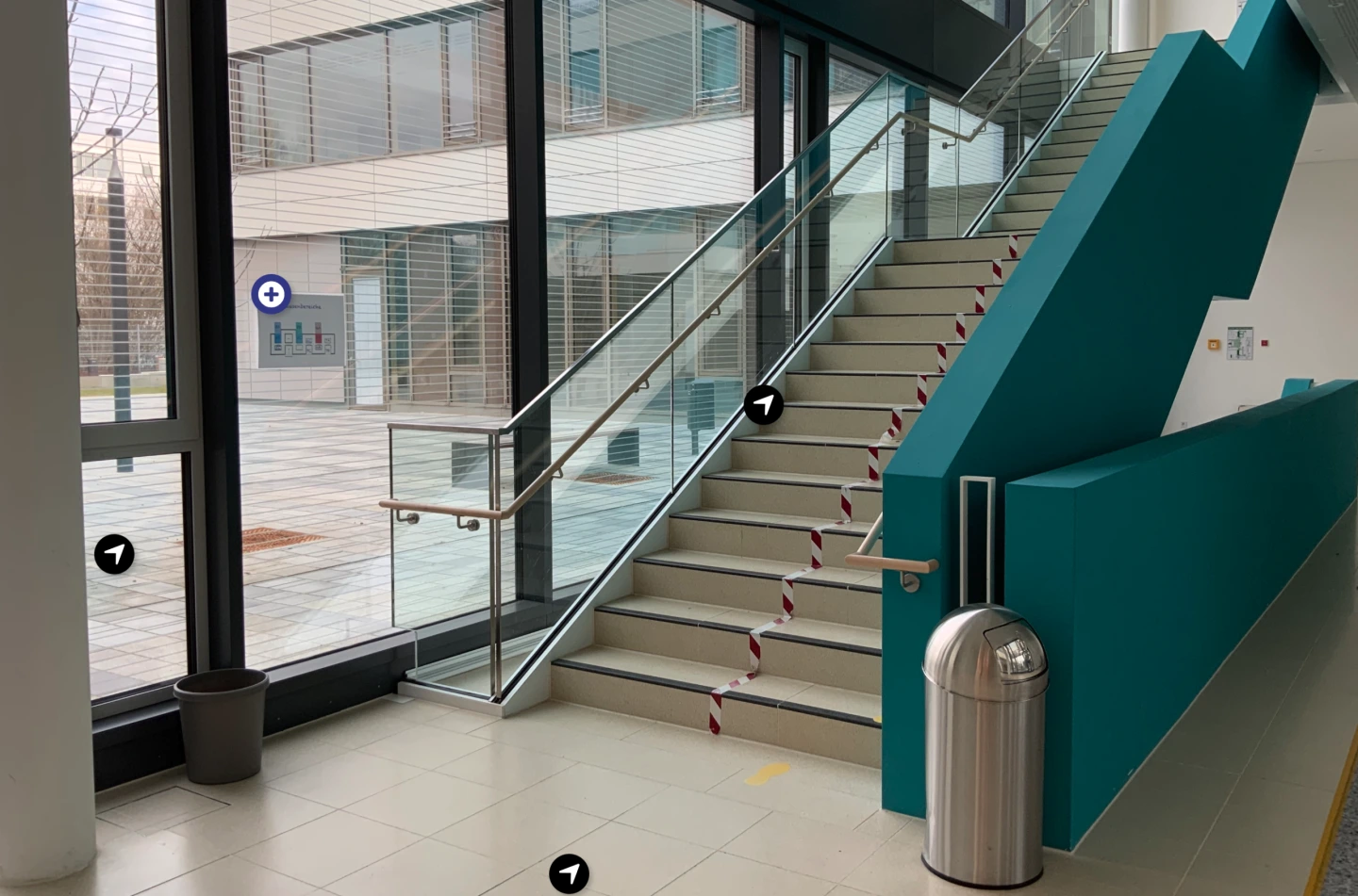 Im Unterrichtsbeispiel sollen die Lernenden die Direktorin befreien, indem sie virtuell durch die Schule laufen und einen Code knacken. Vorab werden von dem Gebäude Fotos gemacht und sortiert, in Gruppen können dann zu den Bereichen Aufgaben erstellt werden. Die Pfeile navigieren zu den Aufgaben.