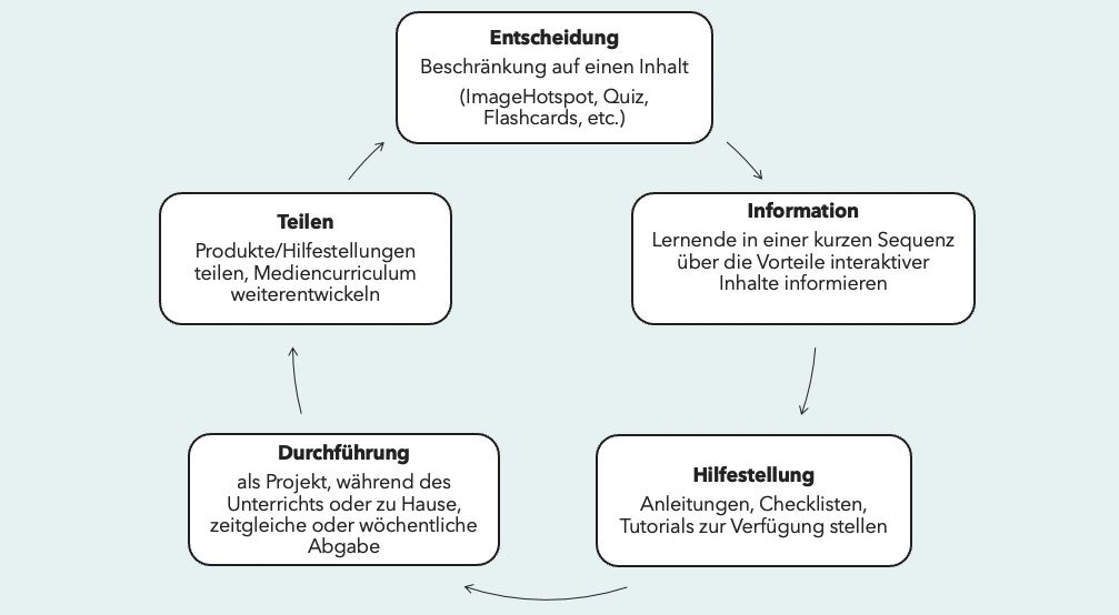 Es bietet sich an, wesentliche „Standardwerkzeuge“ im Mediencurriculum zu verankern, die verbindlich an der Schule umgesetzt werden müssen. Sachverhalte lassen sich mithilfe von digitalen und interaktiven Materialien anschaulich darstellen. Mit H5P-Modulen können Lehrende ihr Verständnis unmittelbar überprüfen, kreativ und produktiv werden. Diese Art der Wissensvermittlung und -sicherung ist in vielen didaktischen Konzepten umsetzbar.
