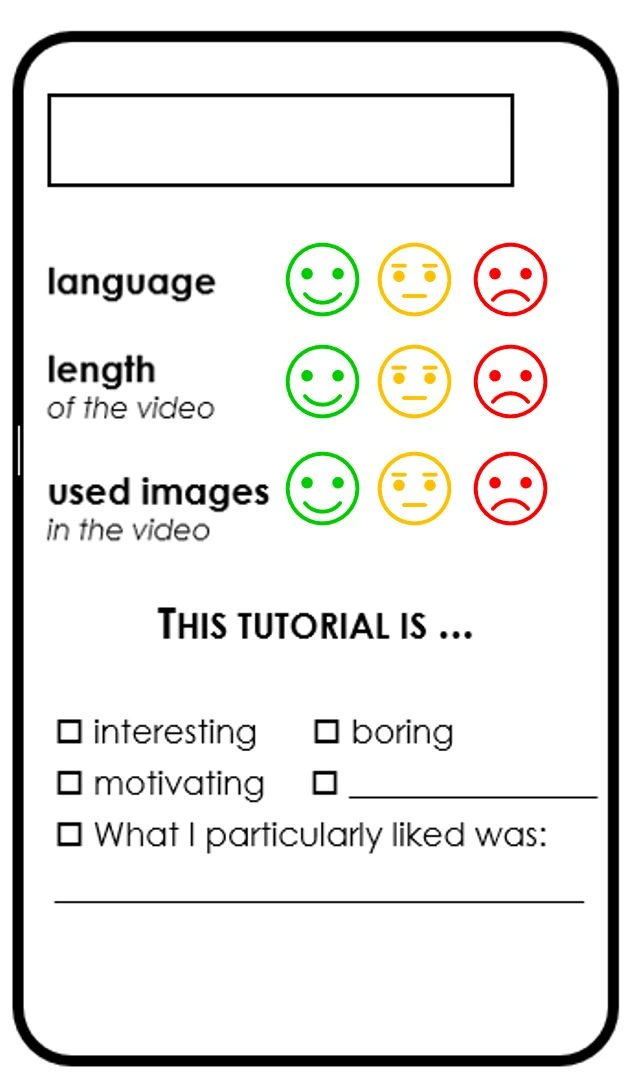 Alle erstellten Videos werden der gesamten Klasse über eine Lernplattform zur Verfügung gestellt. Die Schülerinnen und Schüler haben die Möglichkeit, die Videos mit Hilfe eines kleinen Feedback-Bogens zu bewerten und zu kommentieren.