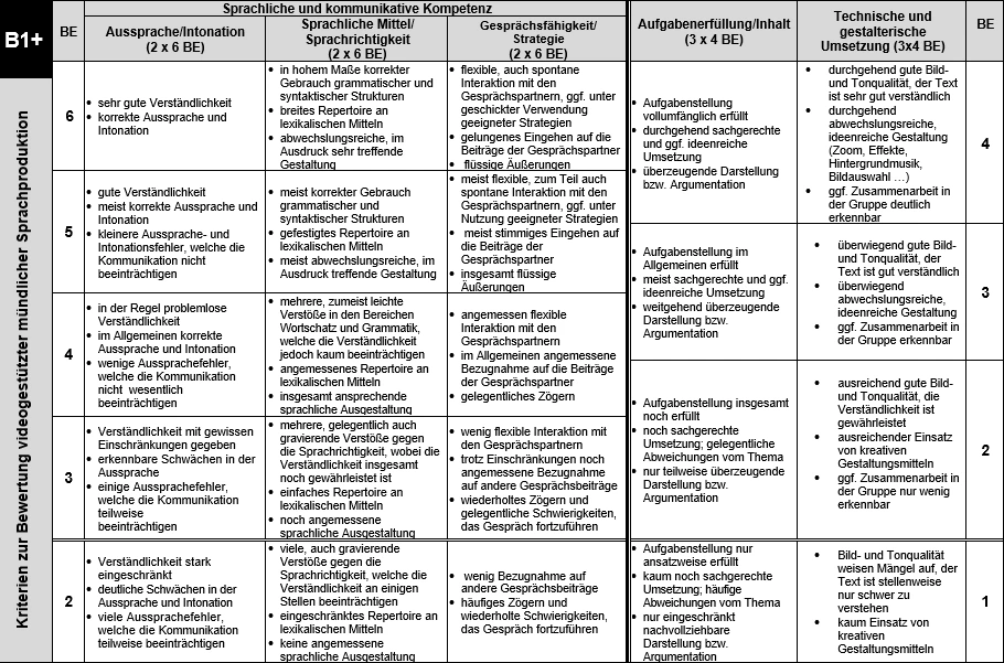 Das Bewertungsraster des ISB für mündliche Sprachproduktion wurde um den Aspekt „technische und gestalterische Umsetzung“ erweitert. So kann der Beitrag jedes einzelnen Schülers und jeder einzelnen Schülerin bewertet werden.