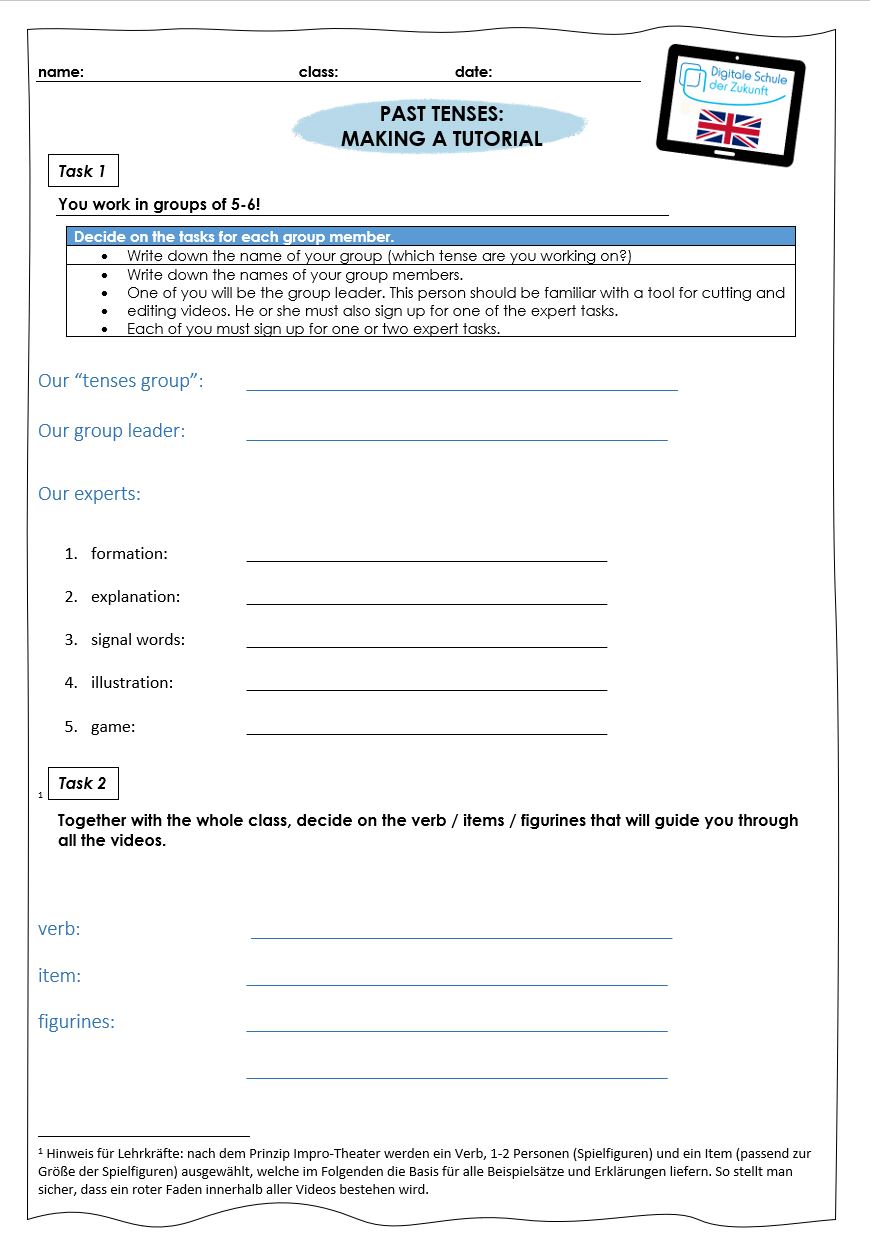 In Gruppenarbeit erstellen die Schülerinnen und Schüler jeweils ein Erklärvideo zu einer der englischen Zeiten der Vergangenheit (simple past, past progressive, present perfect, present perfect progressive, past perfect). Alle produzierten Videos sollen nach dem folgenden Muster aufgebaut werden: