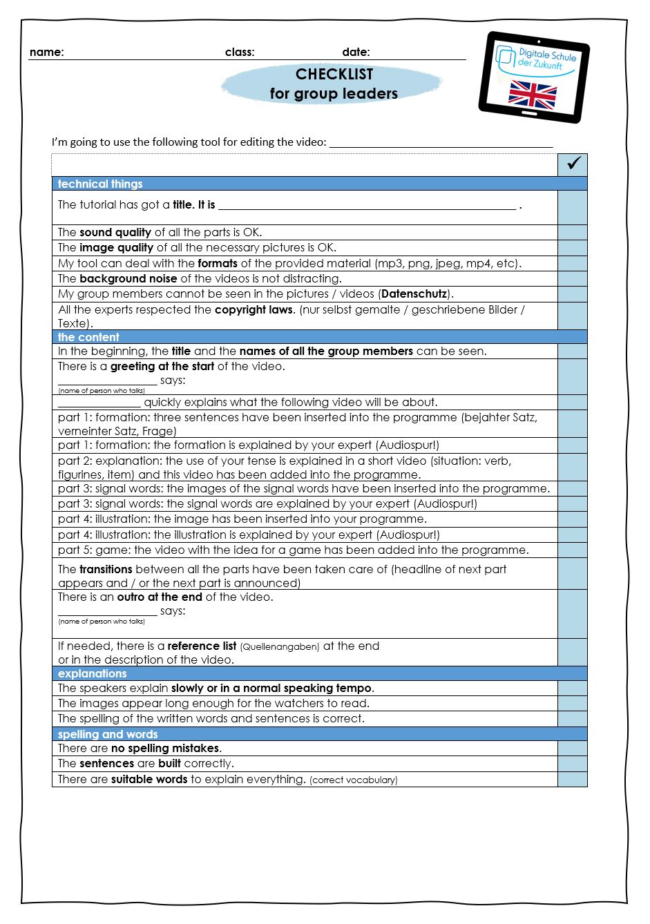 Der zur Verfügung gestellte Leitfaden soll den „group leaders“ bei ihrer Aufgabe helfen. Während die „group leaders“ mit jeweils einem „expert“ am Video arbeiten, befassen sich die restlichen Schülerinnen und Schüler mit den Spielen, die alle „games-experts“ zur Einübung der jeweiligen „tense“ entworfen haben. Diese sind im entsprechenden mebis-Ordner für alle Schülerinnen und Schüler verfügbar und können so innerhalb der jeweiligen „tenses group“ gespielt werden.
