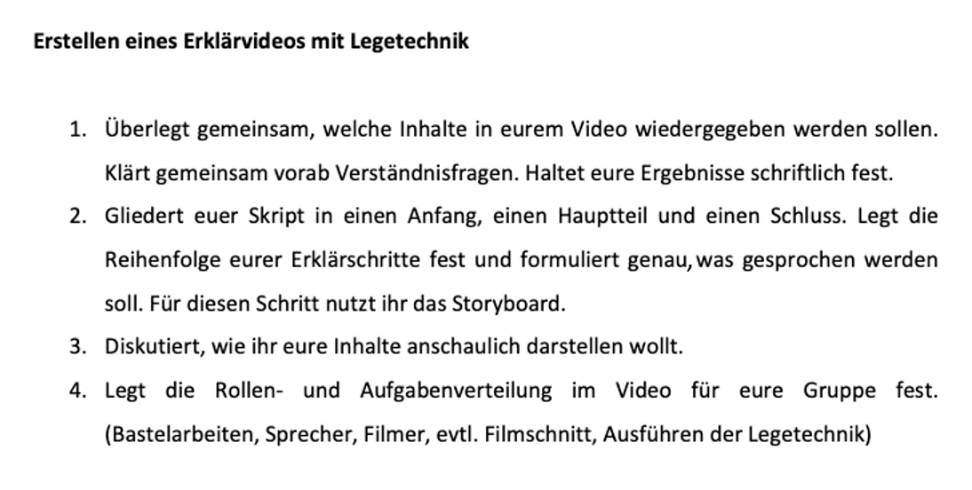 In den jeweiligen Gruppen erhalten die Lernenden ein Arbeitsblatt, auf dem die Vorgehensweise aufgeführt ist (siehe rechts). Zudem wird ihnen die Vorlage für ihr eigenes Storyboard ausgehändigt. Die Ausgabe der Unterlagen erfolgt jeweils in digitaler und ausgedruckter Form.
