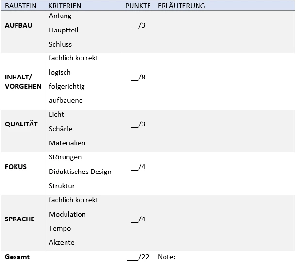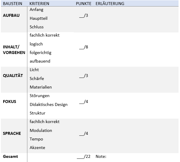 1. Teil: Bewertung des Videos – Das Produkt selbst wird unter Einbezug der erarbeiteten Kriterien bewertet. Diese Note ist eine Gruppennote, jeder Schüler und jede Schülerin der Gruppe erhält dieselbe Beurteilung.
