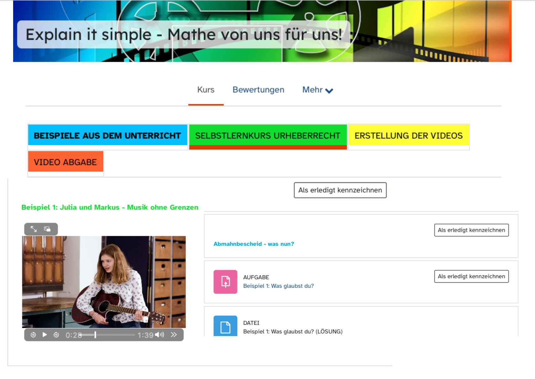 In einer abwechslungsreichen und interaktiven Selbstlerneinheit (in einem mebis-Kurs) werden die Kinder motiviert, sich mit der Materie Urheberrecht auseinanderzusetzen, wobei die Ansammlung von Faktenwissen über dieses Thema das Hauptziel der Einheit darstellt. Diese asynchrone Vorgehensweise hat den Vorteil, dass jedes Kind in seinem eigenen Tempo vorgehen kann. Durch die mebis-Anwendungen Forum und Test mit verfügbaren Lösungen nach Abschluss jeder Aktivität kann der Lernfortschritt selbstständig erzielt und evaluiert werden