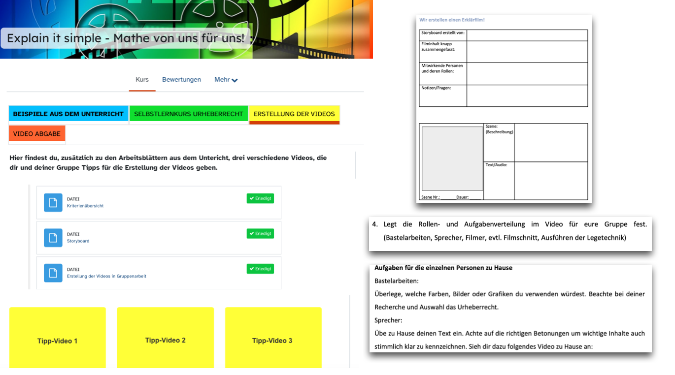 Bevor die Arbeit beginnt, erhalten die Schülerinnen und Schüler eine kurze Einführung zur Erstellung eines Erklärvideos in einer Gruppe. Dazu stehen ihnen drei Videoimpulse im mebis-Kurs zur Verfügung. Zunächst sollen sie sich selbstständig über ihren Themenbereich informieren. Verschiedene Schulbücher, Arbeitshefte und das Internet (Tablet) unterstützen sie dabei.