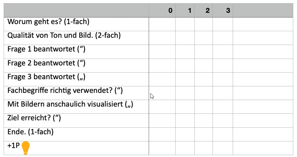 Die von Schülerinnen und Schülern produzierten Videos können über eine Lernplattform eingereicht und anderen zur Verfügung gestellt werden. Folgendes Bewertungsraster dient als Grundlage für das Feedback an die Lernenden.