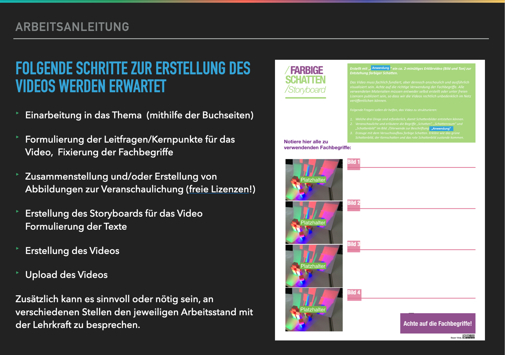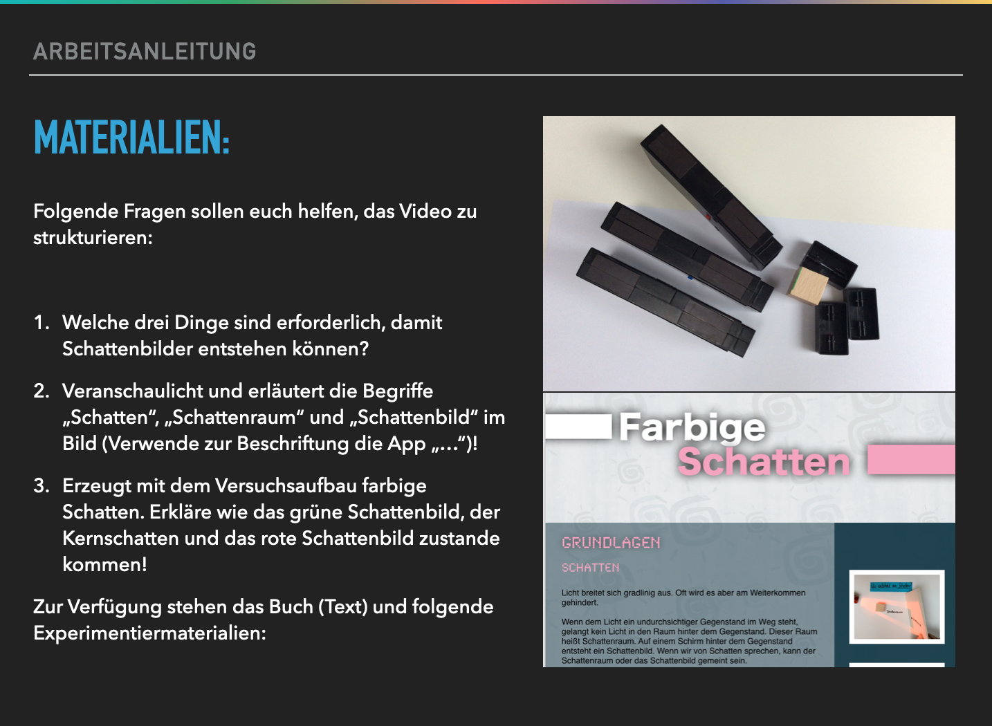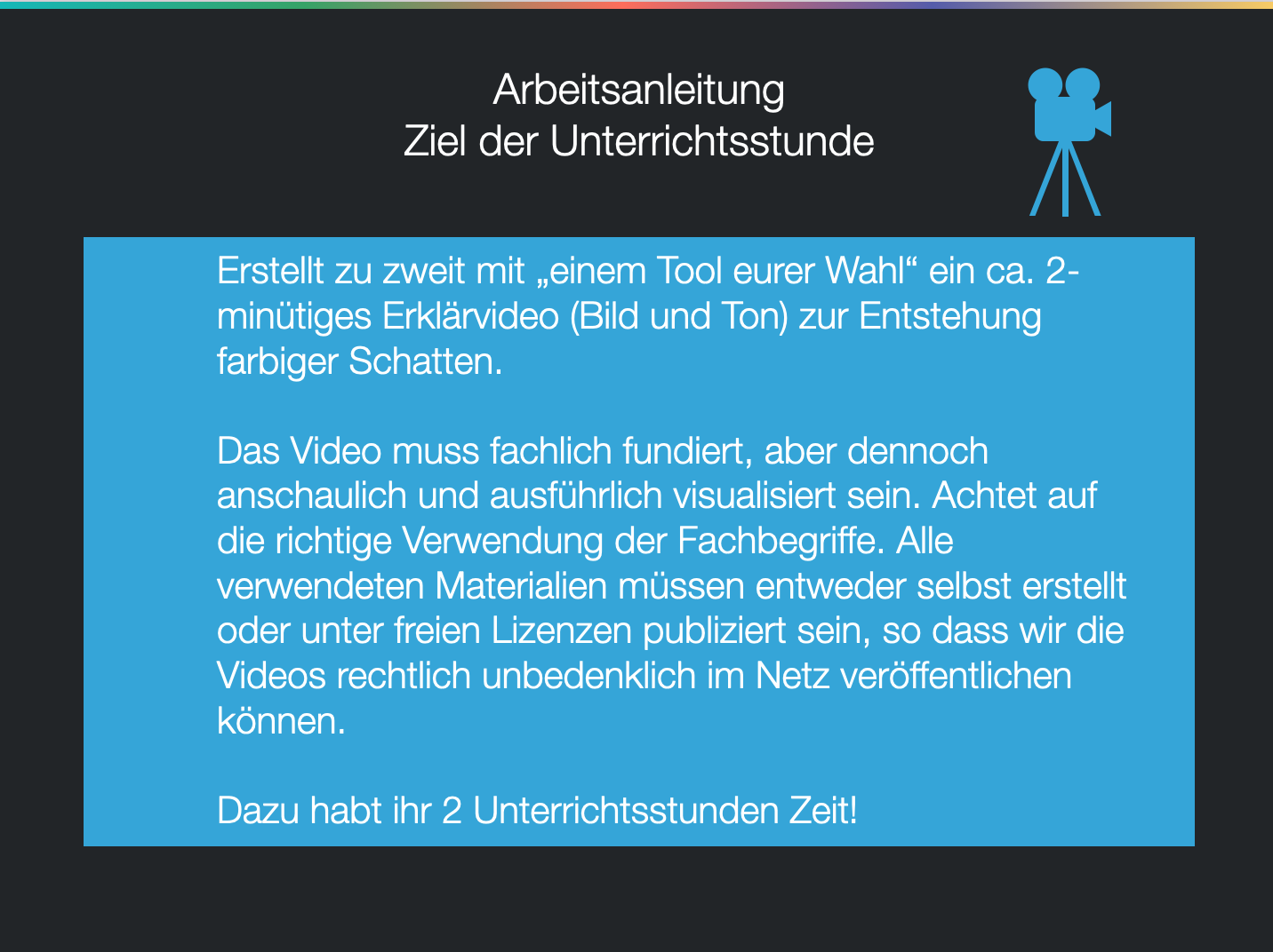 In der Unterrichtseinheit „Farbige Schatten“ erschließen sich die Schülerinnen und Schüler selbstständig die physikalischen Grundlagen zu Kern- und Halbschatten. Durch den Auftrag zur Videoproduktion schlüpfen sie in die Rolle des Lehrenden. Dieser Vorgang hat für sie fachlichen, didaktischen und kreativen Wert: Sie müssen das Wesentliche erkennen und fachlich fundiert, visuell ansprechend sowie adressatengerecht aufbereiten.