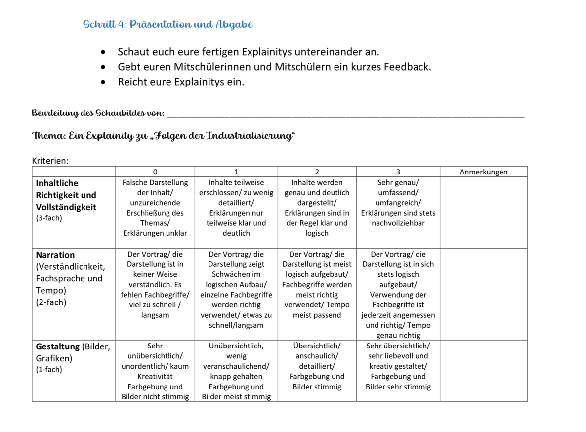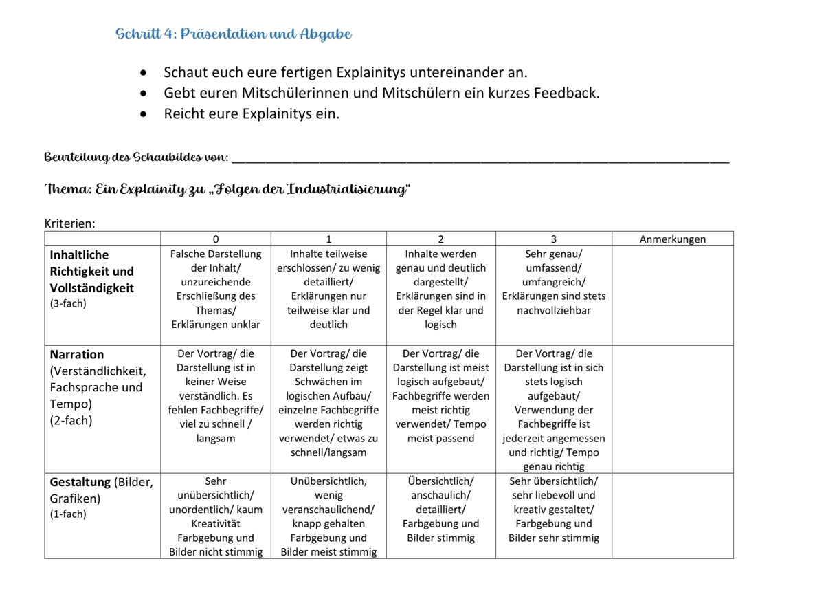 Die von den Schülerinnen und Schülern erstellten Explainity-Videos sollen vorab gegenseitig angeschaut und kontrolliert werden. Folgendes Bewertungsschema dient als Grundlage für ein mögliches Peer-to-Peer-Feedback. Das Einreichen der Videos kann über eine geeignete Lernplattform geschehen.